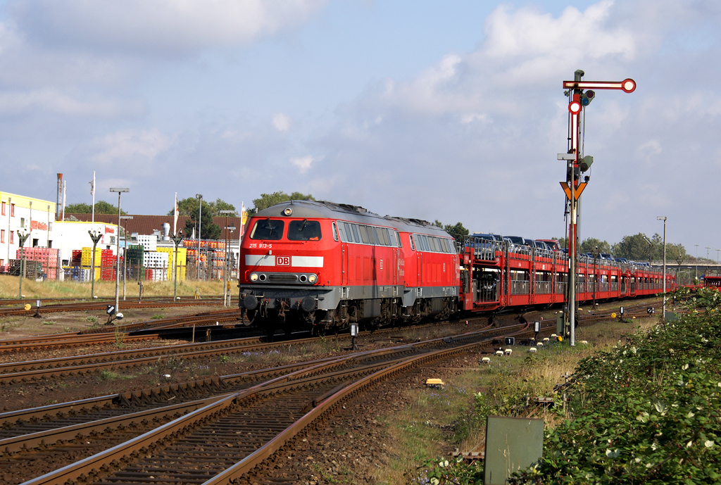 215 901-0 und eine 218er am 26.08.2008 mit einem Autozug nach Niebüll in Klanxbüll. Nur 16 Tage nach der Aufnahme verließ 215 901-0 mit anderen 215.9 den Norden gen Chemnitz.Dieses bedeutete gleichsam das Einsatzende der Baureihe 215.9 bei DB AutoZug SyltShuttle. Julian Düll