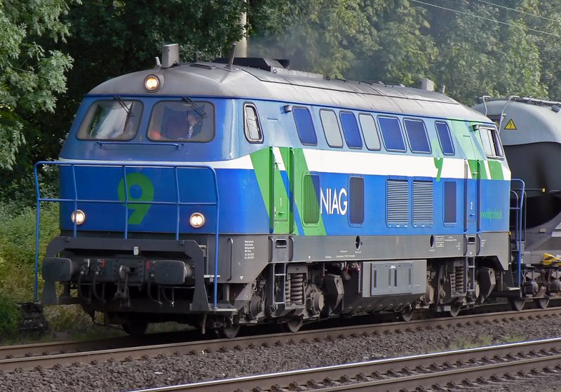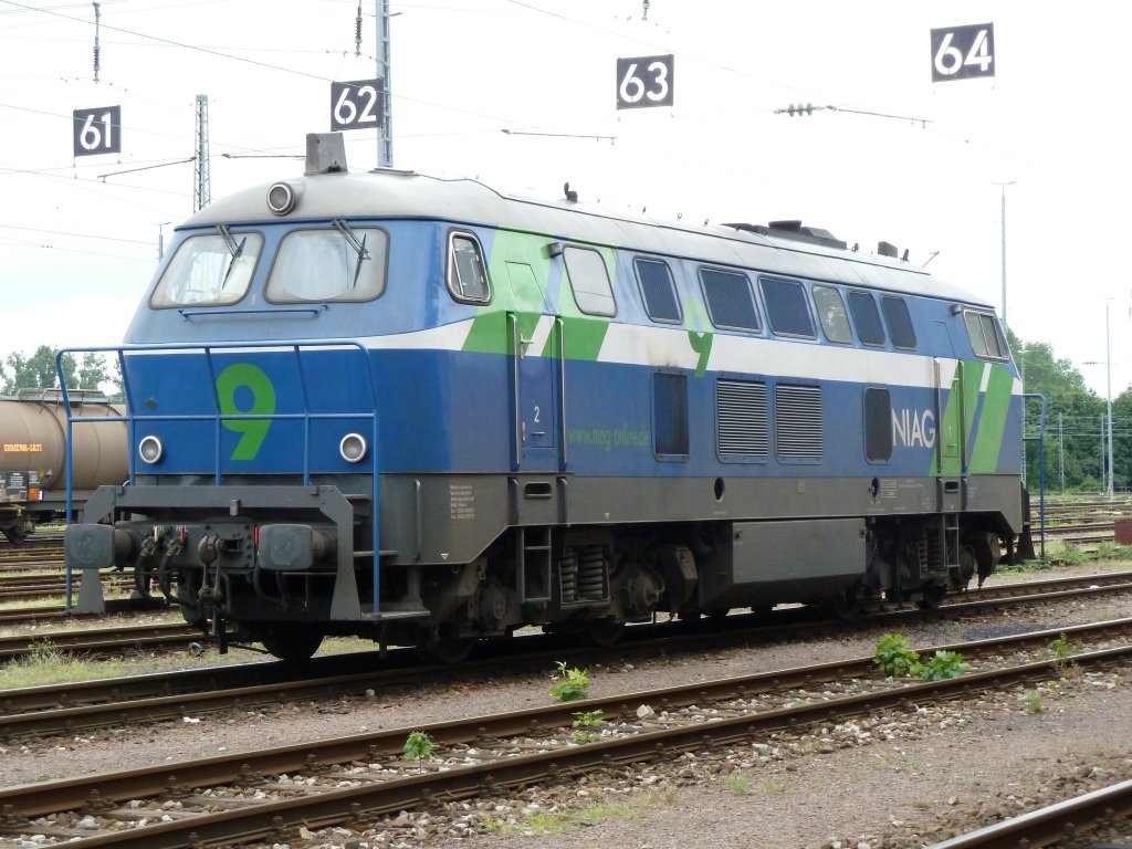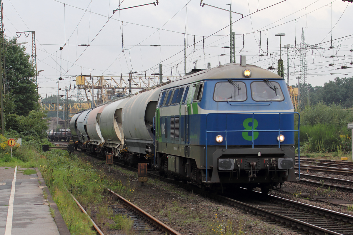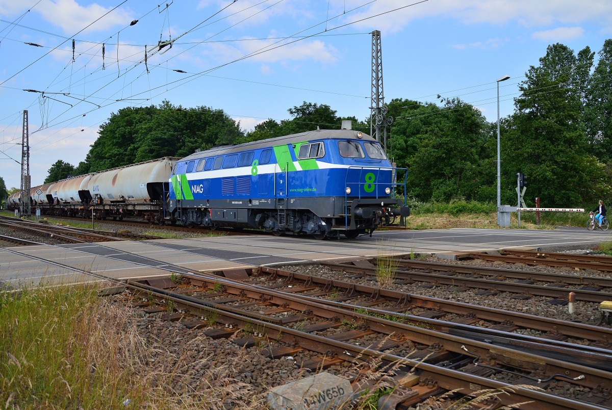 Hier kommt die NIAG 8/alias 216 055-4 mit einem Staubgutkesselwagenzug am Bü Blumenstraße heran gefahren. Der Zug fährt zu RWE-Power, wo er mit Braunkohlenstaub für ein Duisburger Chemieunternehmen befüllt wird.(Dank an Paul Zimmer für die Richtigstellung meines Textes) 9.6.2015 Andreas Strobel