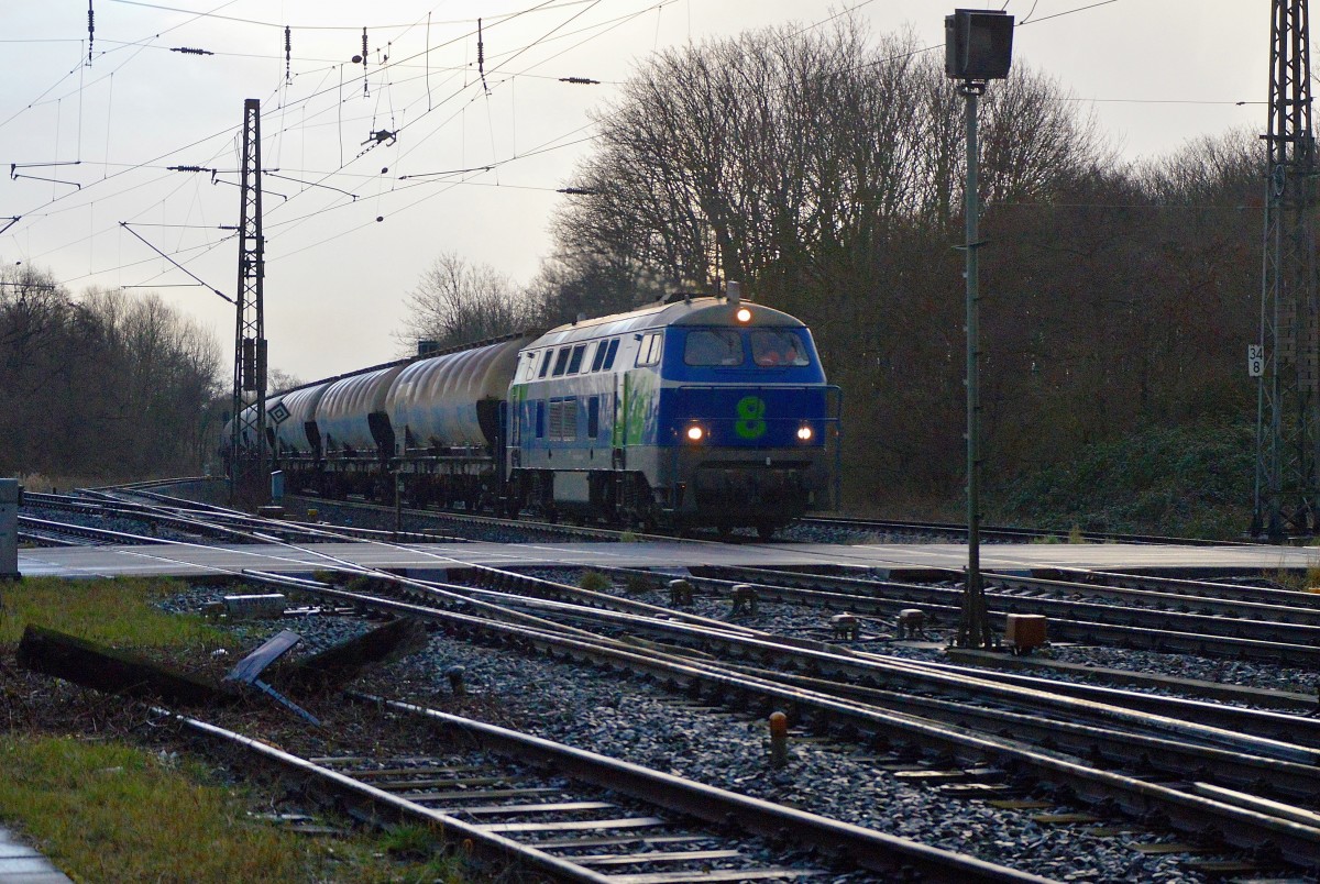 Anfahrend legt sich die NIAG Nr.8 alias 216 055-4 mit einem Silowagenzug in Zeug um auf Geschwindigkeit zu kommen. Mittwoch den 2.3.2016 Andreas Strobel