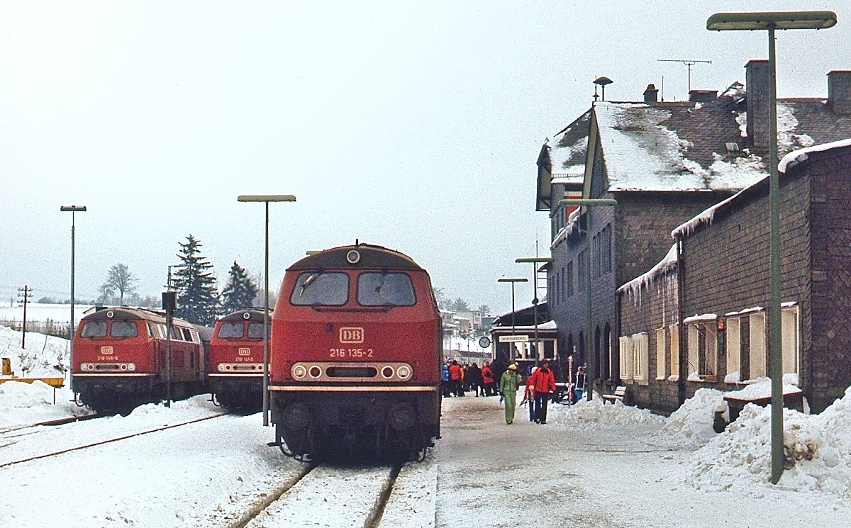Es war einmal... im Bahnhof Winterberg. Am 07.02.1978 sind dort gleich Sonderzüge mit Ausflüglern aus dem Rhein-Ruhrgebiet eingetroffen, von links nach rechts die 218 145-1, 218 141-0 und die 218 136-0. Die Deutsche Bundesbahn setzte solche Sonderzüge bei ausreichender Schneelage regelmäßig ein, heute gehören sie ebenso der Vergangenheit an wie das Bahnhofsgebäude, das durch einen Neubau ersetzt wurde (den die Allianz Pro Schiene 2018 zum Bahnhof des Jahres 2018 wählte). Horst Lüdicke