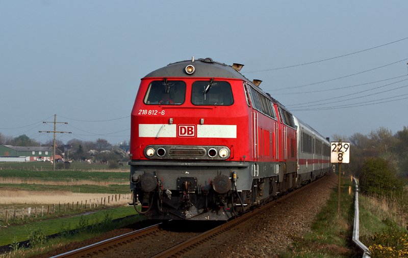 23 Jahre, zwischen 1973 und 1996, war 218 188-1 in Schleswig-Holstein/Hamburg stationiert. Unter der Bezeichnung 218 812-6 dient sie seit 2004 im Süden der Republik als ICE-Abschlepplok. Am 14.04.2009 war sie jedoch nicht in Abschleppdiensten unterwegs und zog einen planmäßigen IC nach Westerland, hier kurz nach der Ausfahrt aus dem Bahnhof von Morsum.
