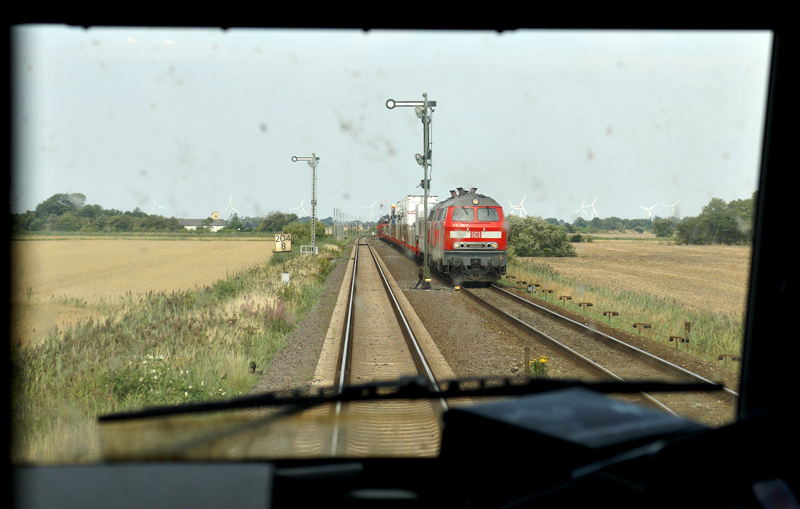 218 190-7 und eine Schwesterlokomotive am 6.08.2009 mit einem Autozug nach Niebüll im Bbf Lehnshallig. Zur Info: Das Foto entstand durch die geschlossene Glastür zum Steuerwagen in einer "Altbau-Einheit".