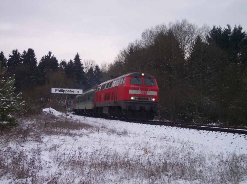 218 190-7 rauscht am 27.01.04 mit einem RE RIchtung Köln durch Philippsheim an der Eifelstrecke.