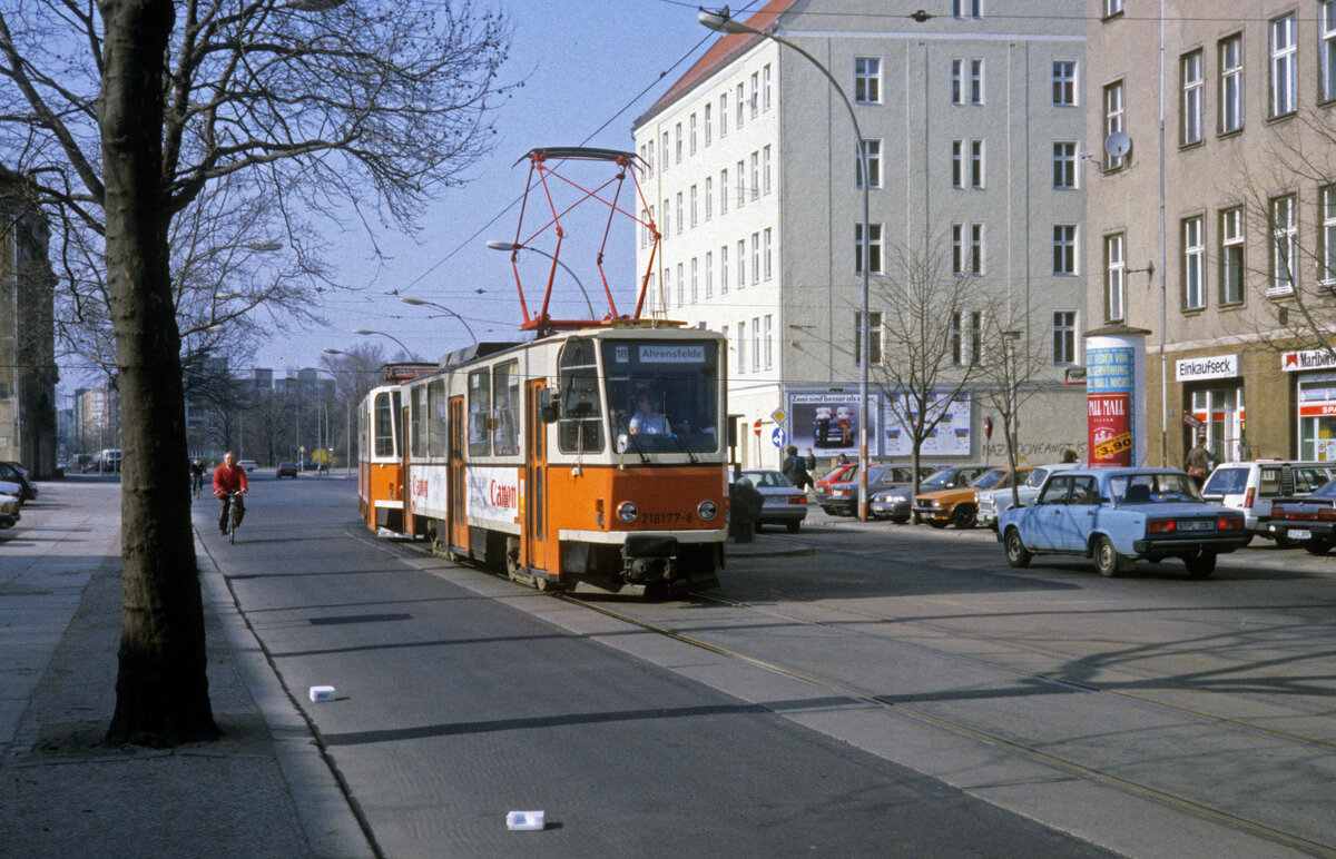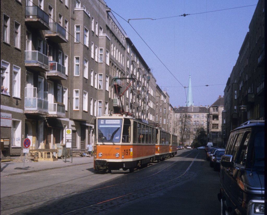 Berlin BVG SL 18 (T6A2 218 197-0) hat eben die Abfahrtshaltestelle in der Wöhlertstraße (Mitte) verlassen und fährt am ehemaligen Stadion der Weltjugend (1973-1992, von 1950 bis 1973 Walter-Ulbrecht-Stadion) in der Chausseestraße vorbei. Aufnahmedatum: April 1993. - Scan eines Diapositivs. Kamera: Leica CL. Kurt Rasmussen