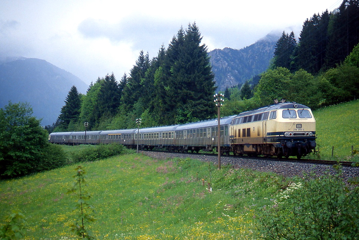 Abgesehen von den höher gewachsenen Tannen und den Fahrzeugen hat sich in den vergangenen 26 Jahren auf diesem Abschnitt der KBS 955 bei Fischhausen nicht viel verändert: Oben fährt 218 356-4 mit einer Silberling-Garnitur im Juni 1991 nach München, unten bedienen der BOB-VT 110 und ein weiterer Integral am 10.09.2017 dieselbe Verbindung Horst Lüdicke