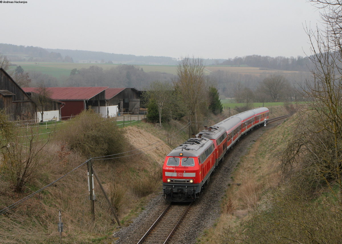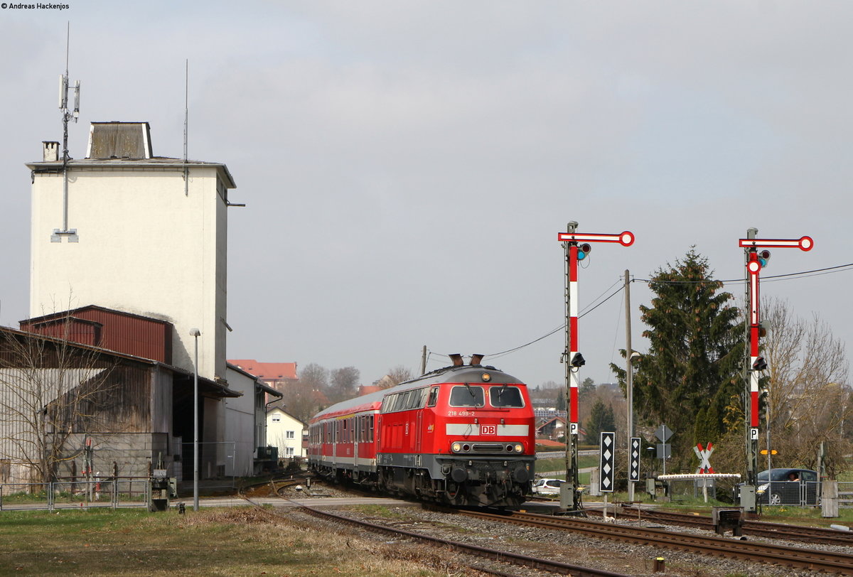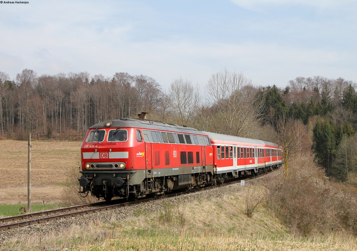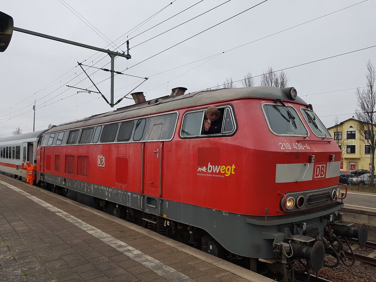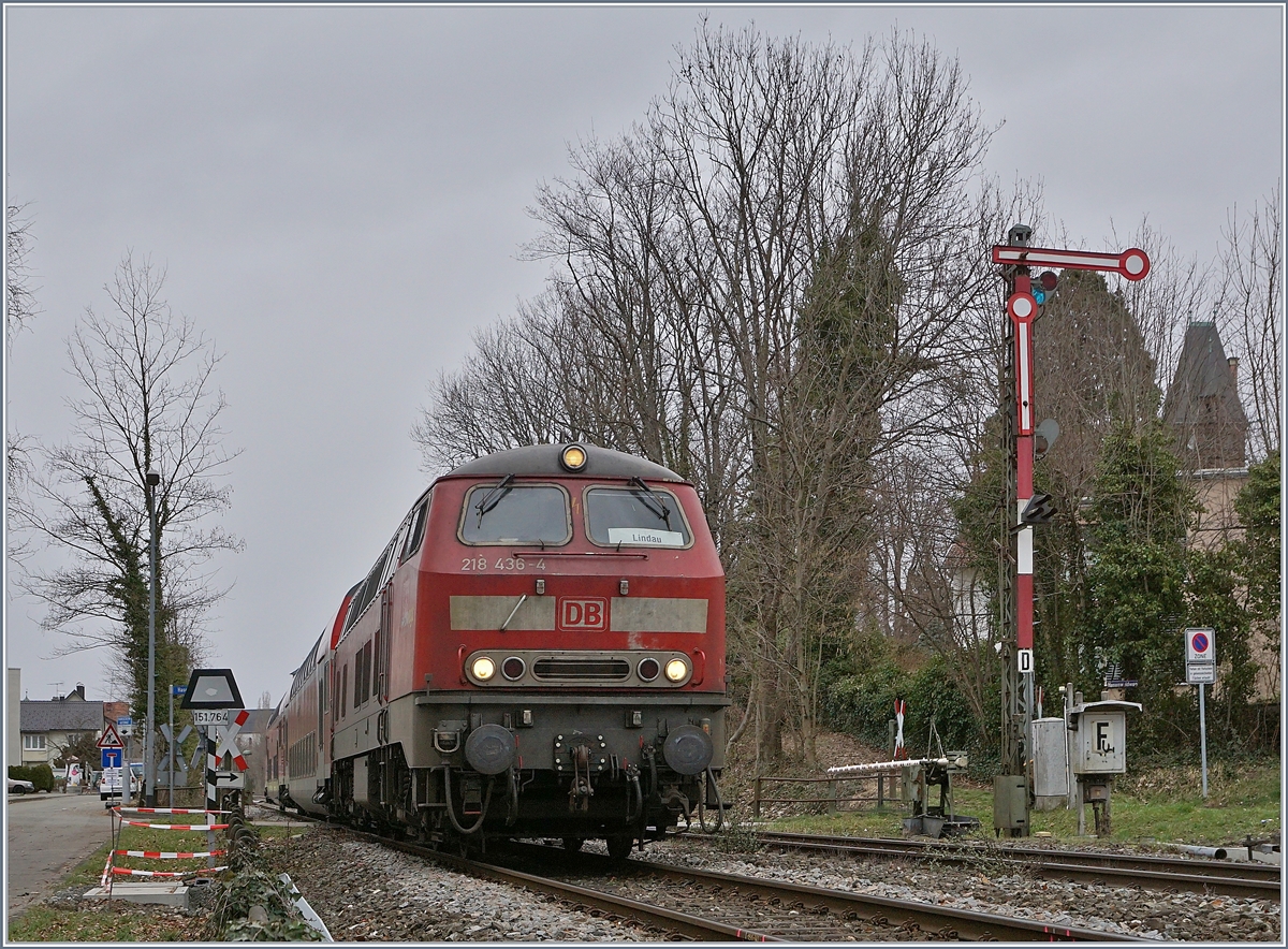 Die DB 218 436-4 hat das Einfahrtsignal der Gegenrichtung von Lindau Aeschbach passiert und erreicht mit ihrem IRE von Stuttgart* in Kürze Lindau Hbf. *Baustellenbeding: ev. verkürzter Zuglauf 14. März 2019