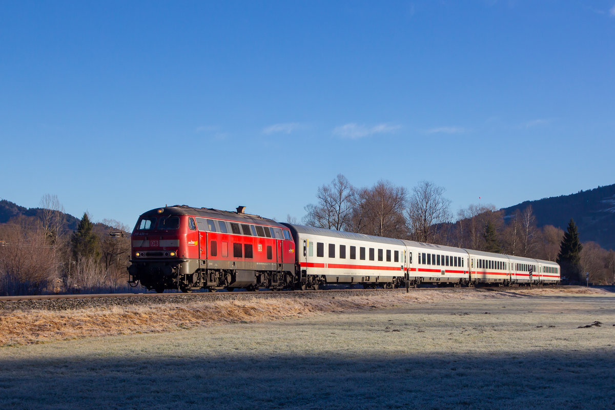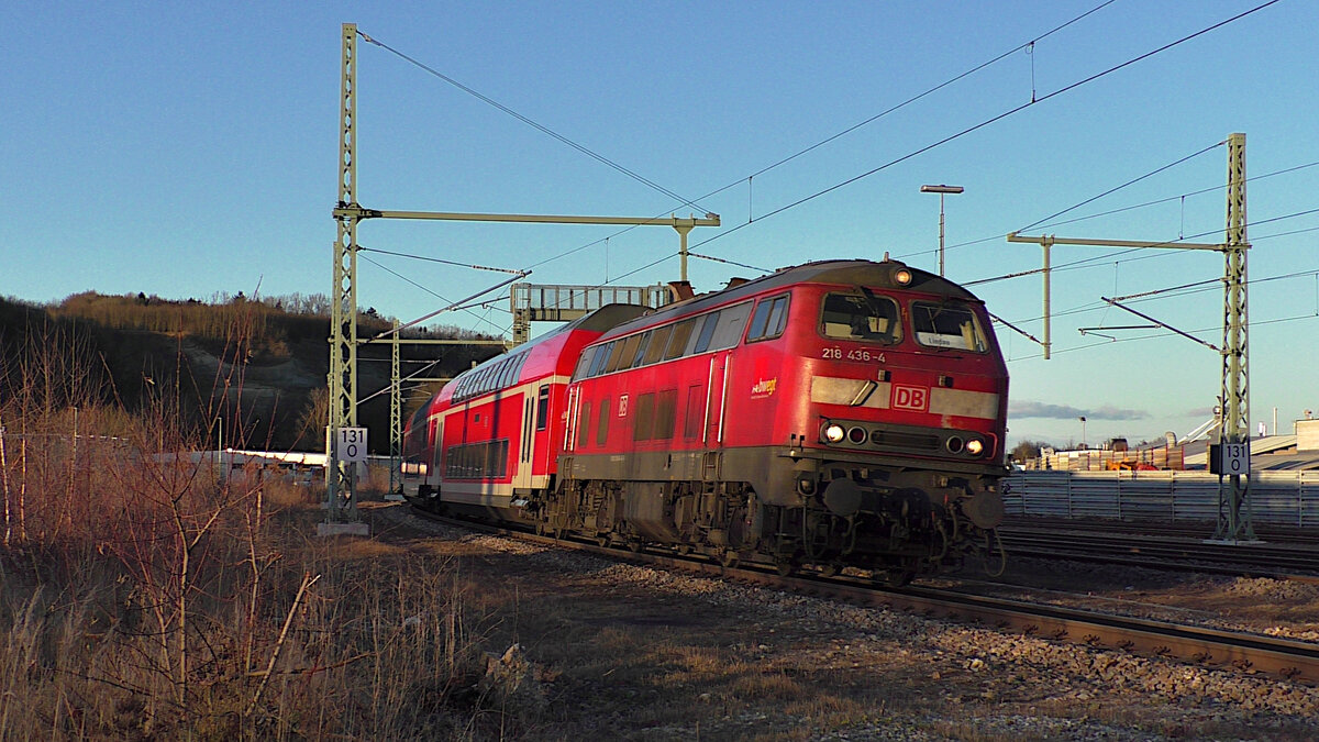 DB 218 436-4 zieht am 07. Dezember 2021 einen ihrer letzten RE5 in Richtung Lindau-Insel in den Bahnhof Biberach(Riß). Seit dem 12.12.2021 ist der elektrische Betrieb auf der Südbahn aufgenommen und der RE5 Stuttgart - Lindau fährt nun durchgängig mit einer BR146.