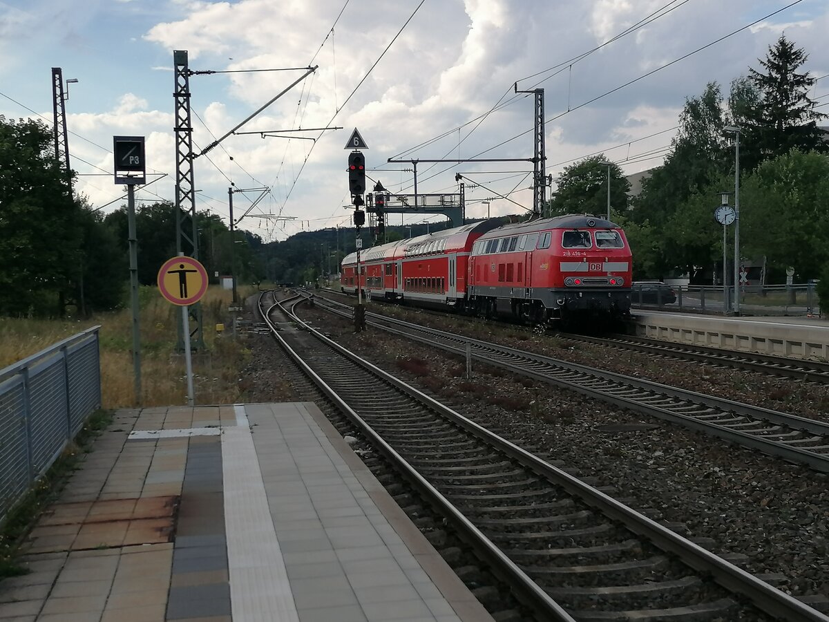 Nachschuss auf einen Regionalexpress nach Stuttgart Hbf. Schublok ist 218 436-4. Ich habe an diesem Tag eigentlich nur 146er an den Regionalexpress auf der Linie 5 gesehen. (30.07.2022)