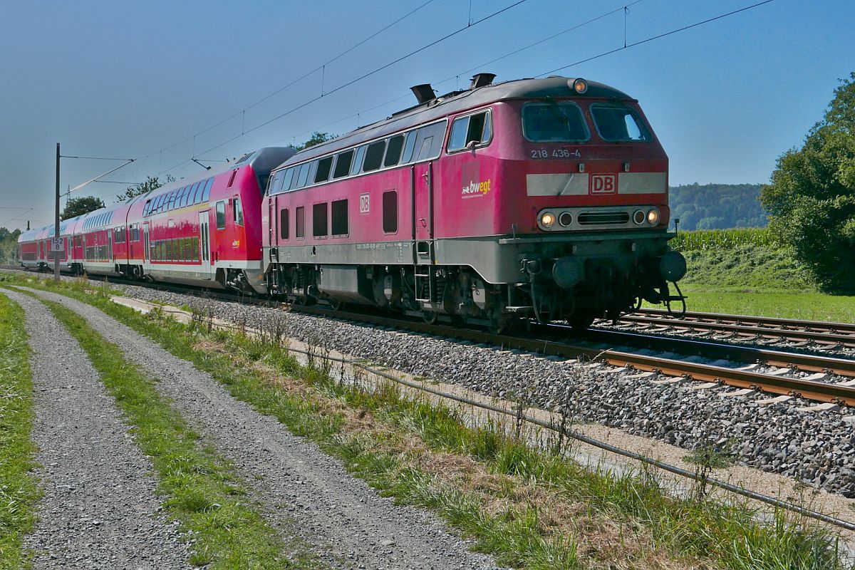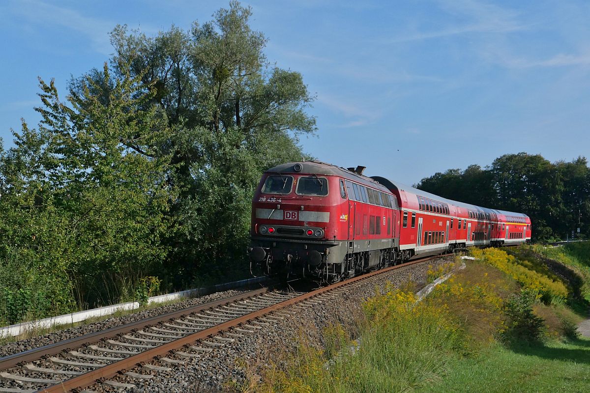 Nicht oft zu sehen, dass auf der Südbahn Doppelstockwagen anstatt geschoben von einer Lok nach Ulm gezogen werden. 218 436-4 mit den Wagen des ex RE 4218, Lindau - Stuttgart, bzw. ex RE 17778, Lindau - Friedrichshafen, zwischen Aulendorf und Bad Schussenried (09.09.2020).