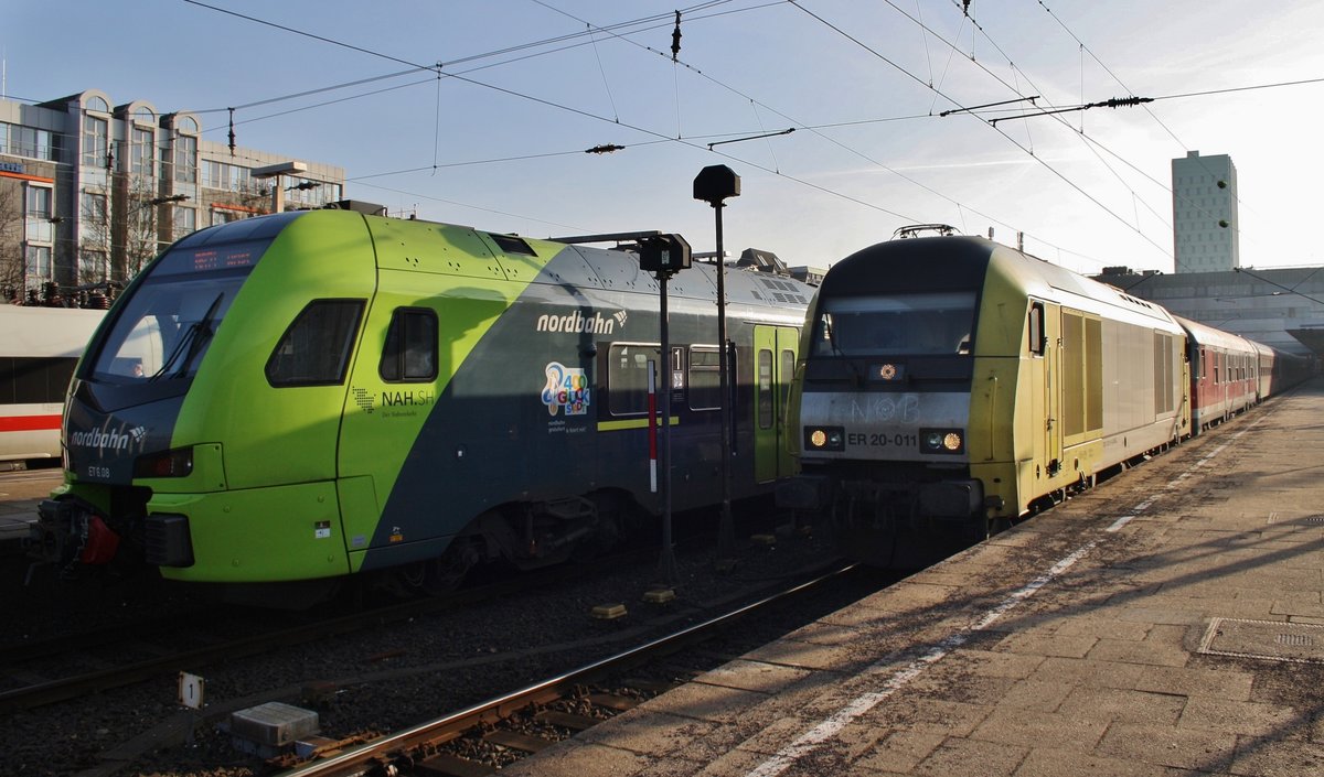 1430 043-8 steht am 28.1.2017 als RB71 (NBE83822) nach Wrist neben 223 011-8 und 223 001-9 (Zugende) mit einem RE6 (RE11020) nach Westerland(Sylt) in Hamburg-Altona.