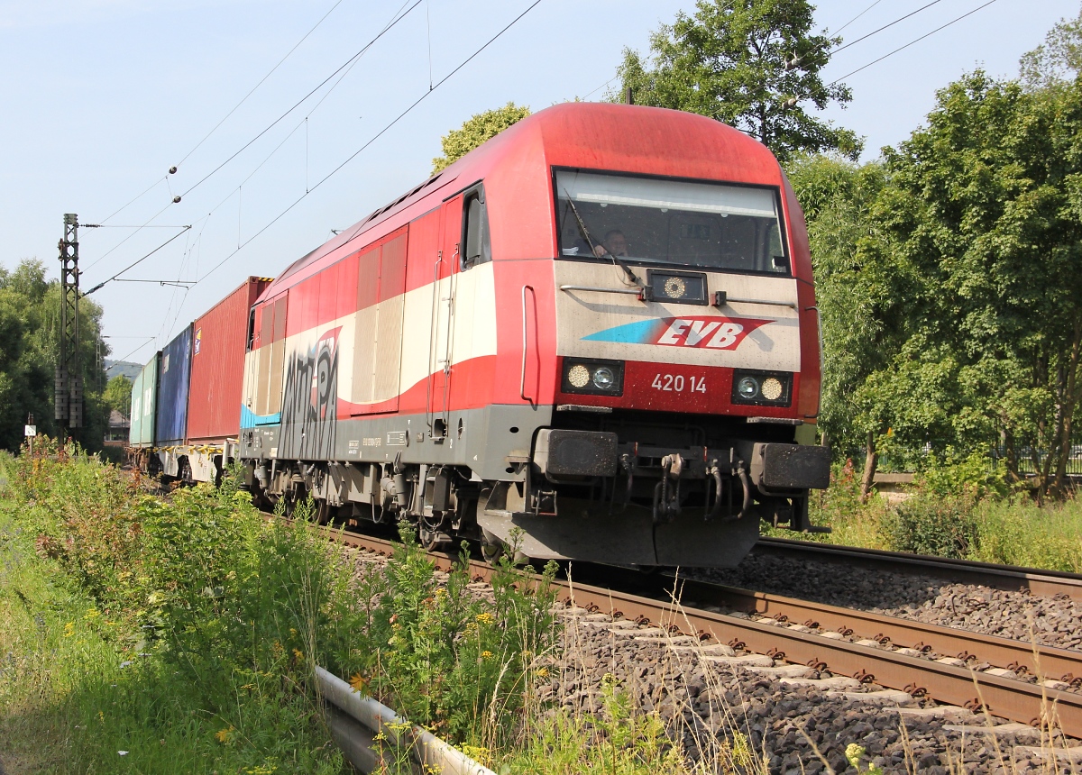 Ein Erlebnis der besonderen Art war der Vossloh High Speed Grinder in Aktion. Er wurde von der EVB 420 14 (223 034-0) in Richtung Süden gezogen. Aufgenommen am 22.07.2014 in Eystrup. Jens Baumhauer