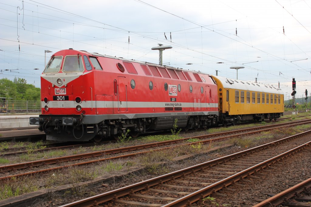 MEG 304 (218 390-3) Mitteldeutsche Eisenbahn GmbH mit einem Messwagen und dem MEG "U-Boot" 301 (229 120-1) in Stendal. Die Reise ging in Richtung Salzwedel weiter. 26.05.2014 Stephan Kemnitz