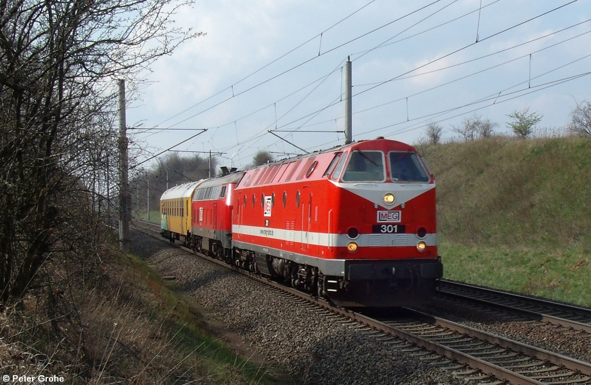 MEG 229 120-1 (ex DR 119 120-4, Bj. 1983 FAUR) + MEG 218 390-3 (ex DB 218 390-3, Bj. 1975 MaK), MEG 301 + 304 vor Messzug Richtung Magdeburg, KBS 310 Hannover - Magdeburg, fotografiert bei Wellen am 26.03.2014 Frank Grohe