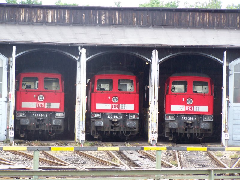 Die Br.232 096-8, Br.232 663-5 und Br.232 258-4 trafen sich gemeinsam im Diesellok-schuppen des BW Nürnberg RBF. Aufgenommen am 2.juni 07. Martin Respondek