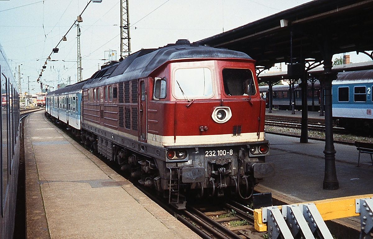 Schnappschuß Ende April 1997 aus einem Interregio im noch nicht umgebauten Erfurter Hauptbahnhof: 232 100-8 vor einem RE. Lugansk (0316/1974) lieferte die Lok als 132 100-9 an die DR, die sie am 26.09.1974 beim Bw Eisenach in Dienst stellte, die z-Stellung erfolgte am 29.05.2008.
