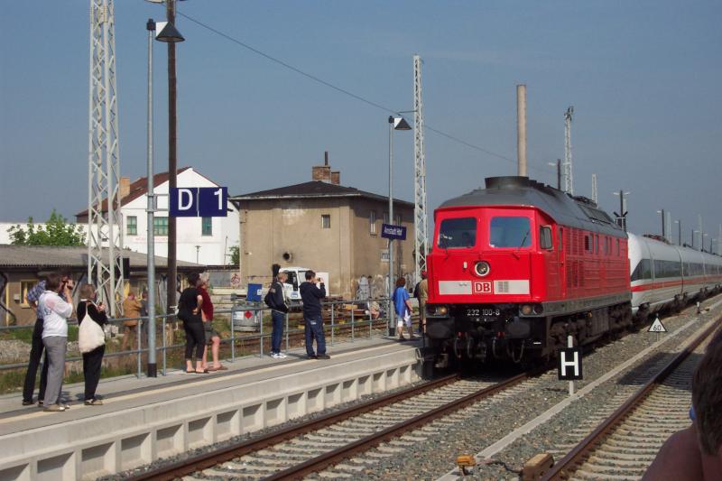 BR 232-100-8 Am 2.5.2004 im Hbf Arnstadt.Die Lok hat gerade den ICE nach Arnstadt geschleppt,da es keinen Fahrdraht mehr in Arnstadt gibt.Dieser ICE wird anlässlich der 1300 Jahrfeier von Arnstadt getauft auf den Namen der ältesten Stadt der ehemaligen DDR.