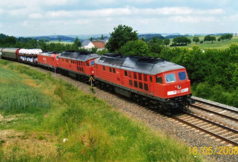 Eine BR 232 184-2 mit einer Schwesterlok und einer BR 185 in der steigung vor Herlasgrün am 18.06.2008