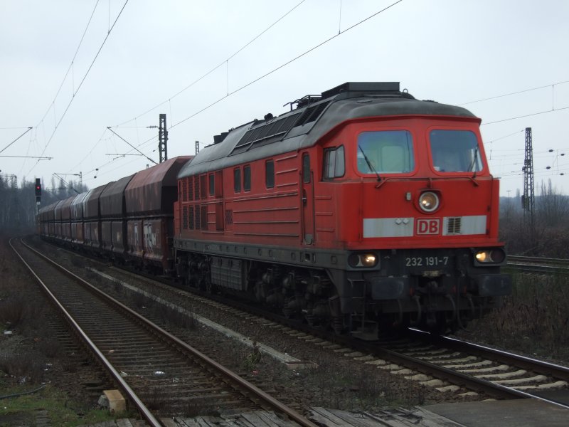 232 191-7 passiert mit einem Ganzzug Schüttgutwagen für den Kali-Transport den Haltepunkt Magdeburg-Eichenweiler. Fotografiert am 22.05.2009 Christian Geschonneck