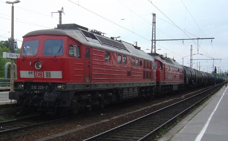 232 228-7 und eine weitere 232 mit Railion-Logo durchfahren am 20.05.2005 Erfurt Hbf mit einem Kesselwagen-Ganzzug.