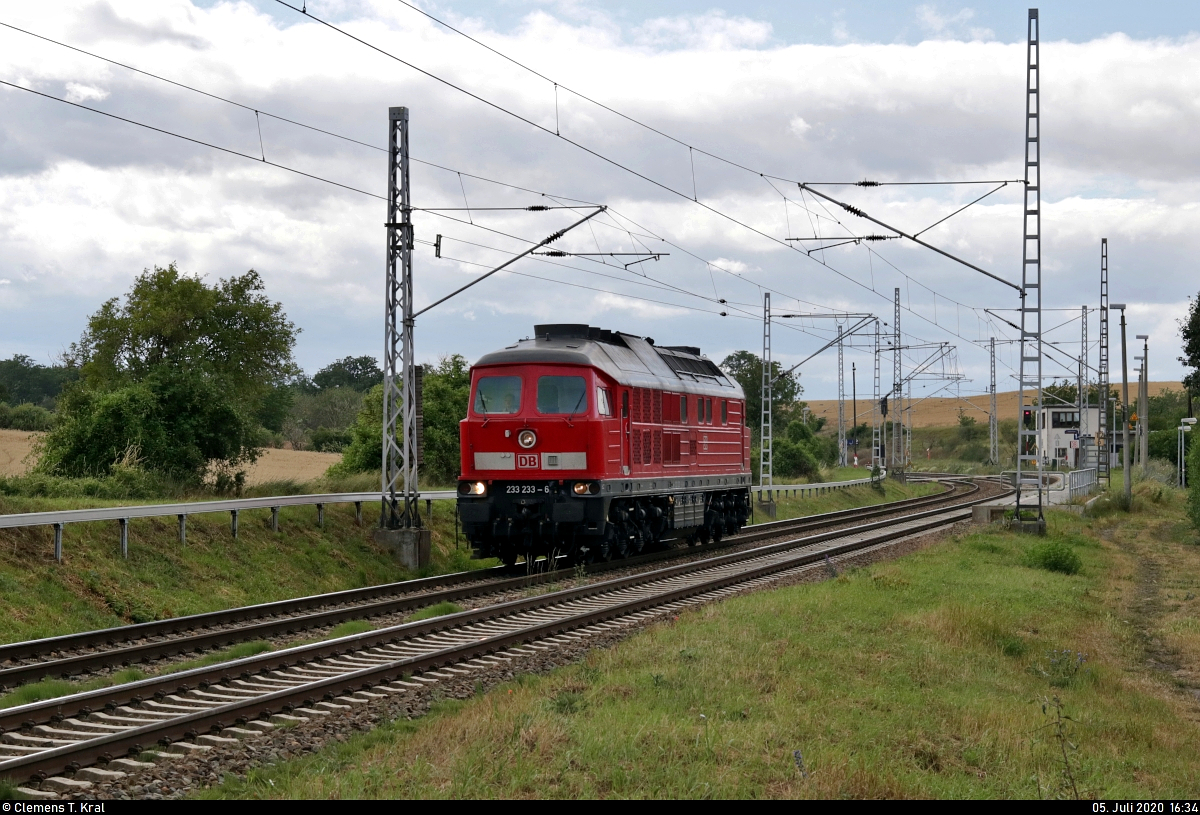 233 233-6 (232 233-7 | 132 233-8) DB als Tfzf fährt in Zscherben auf der Bahnstrecke Halle–Hann. Münden (KBS 590) Richtung Halle (Saale).