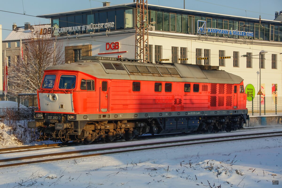 232 283-2 zusammen mit 155 159-7 (beide WFL) und einem vollen Holzzug am 12.3.2021 beim abendlichen Kreuzungshalt am Oberen Bahnhof in Pößneck. Der Zug kam aus Triptis und fuhr nach Kaufering Markus Klausnitzer