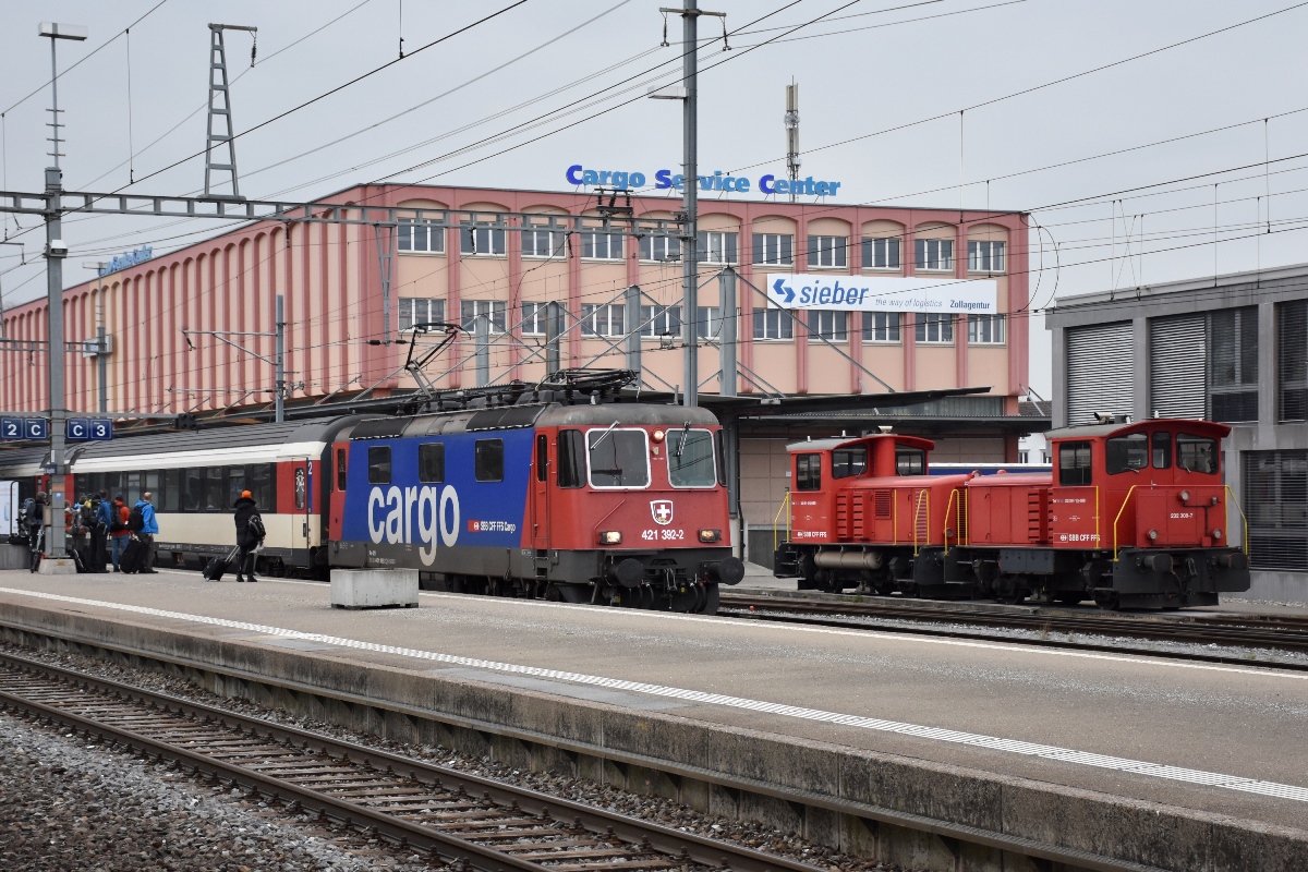 SBB Re 421 392-2 mit dem EC 195 (Zürich – München) erreicht den Bahnhof St. Margrethen SG und passiert dort Tmf 232 301-2 und 308-7 (Tmf 98 85 5 232 301-2 CH-SBB I und Tmf 98 85 5 232 308-7 CH-SBB I) (17.03.2018) Georg Friebe