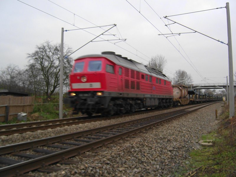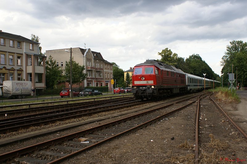 BR 232 308-7 fährt am 25.07.06 mit einem Schotterzug von Forsthaus Eiche in Haldensleben ein (links außerhalb des Bilds befindet sich das Bw Haldensleben und rechts die DB Tankstelle). Phillip Brandt