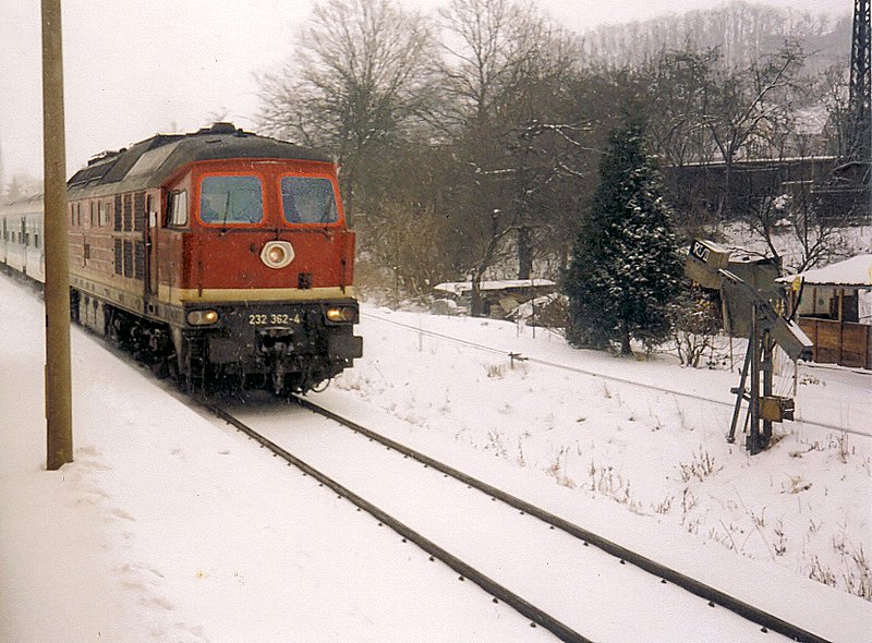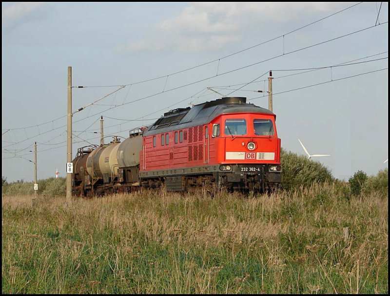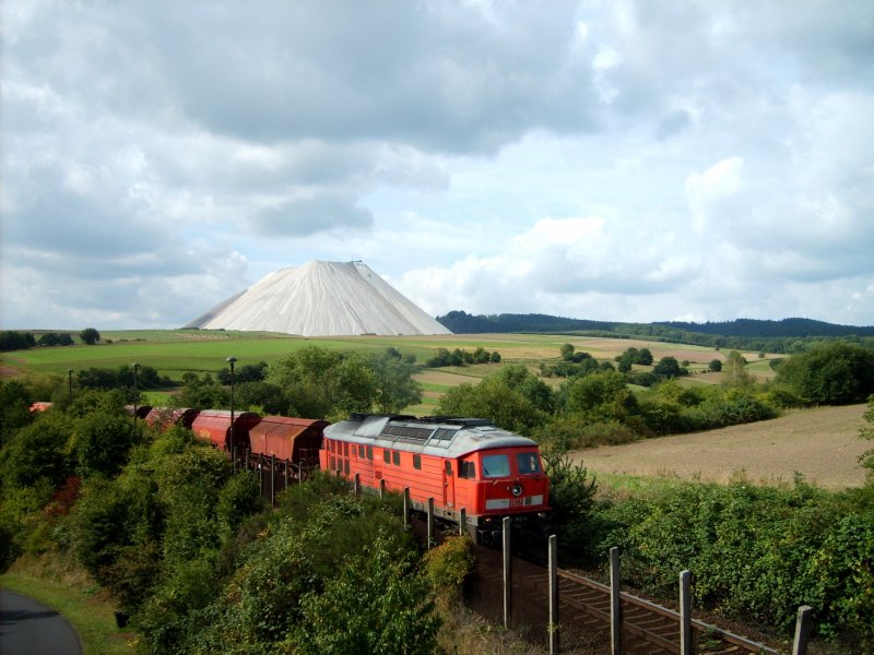 Am 02.09.08 bezwingt 232 362-4 eine Steigung in Dankmarshausen auf der Strecke Heringen-Gerstungen. Am Haken hat sie einen Kali-Zug und im Hintergrund präsentiert sich stolz der "Monte Kali". Stephan Möckel