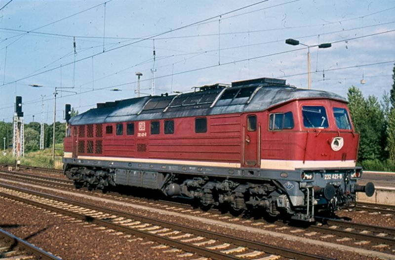Love-Parade am 2. Juliwochenende 1998 in Berlin. Am Bahnhof Schönefeld erreichten fast 50 Sonderzüge aus dem In- und Ausland die Hauptstadt. Von hier aus ging es dann leer weiter nach Berlin-Pankow Gbf. zum Abstellen. Selbstverständlich verkehrten auch Planleistungen. Hier 232 421-8 auf dem Weg nach Seddin