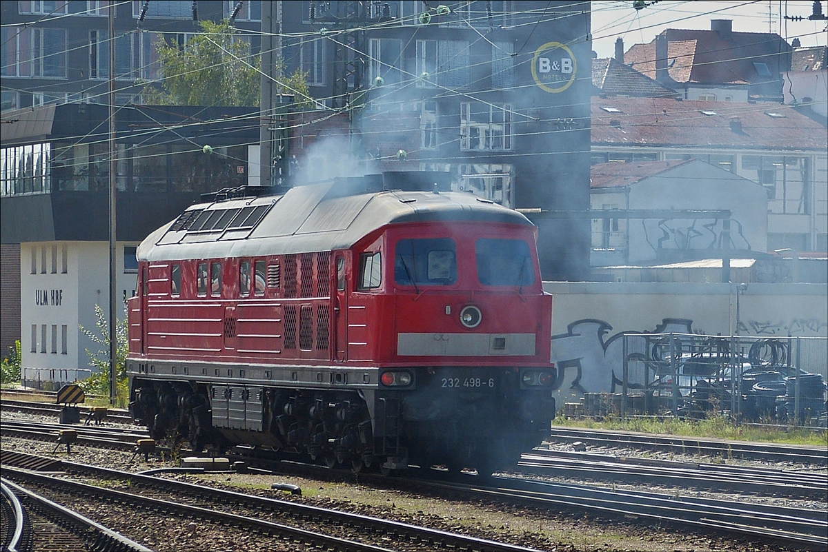 . Ludmilla 232 498-6 durchfährt mit einer leichten Rauchfahne den Bahnhofsbereich von Ulm 05.09.2017 (Hans)