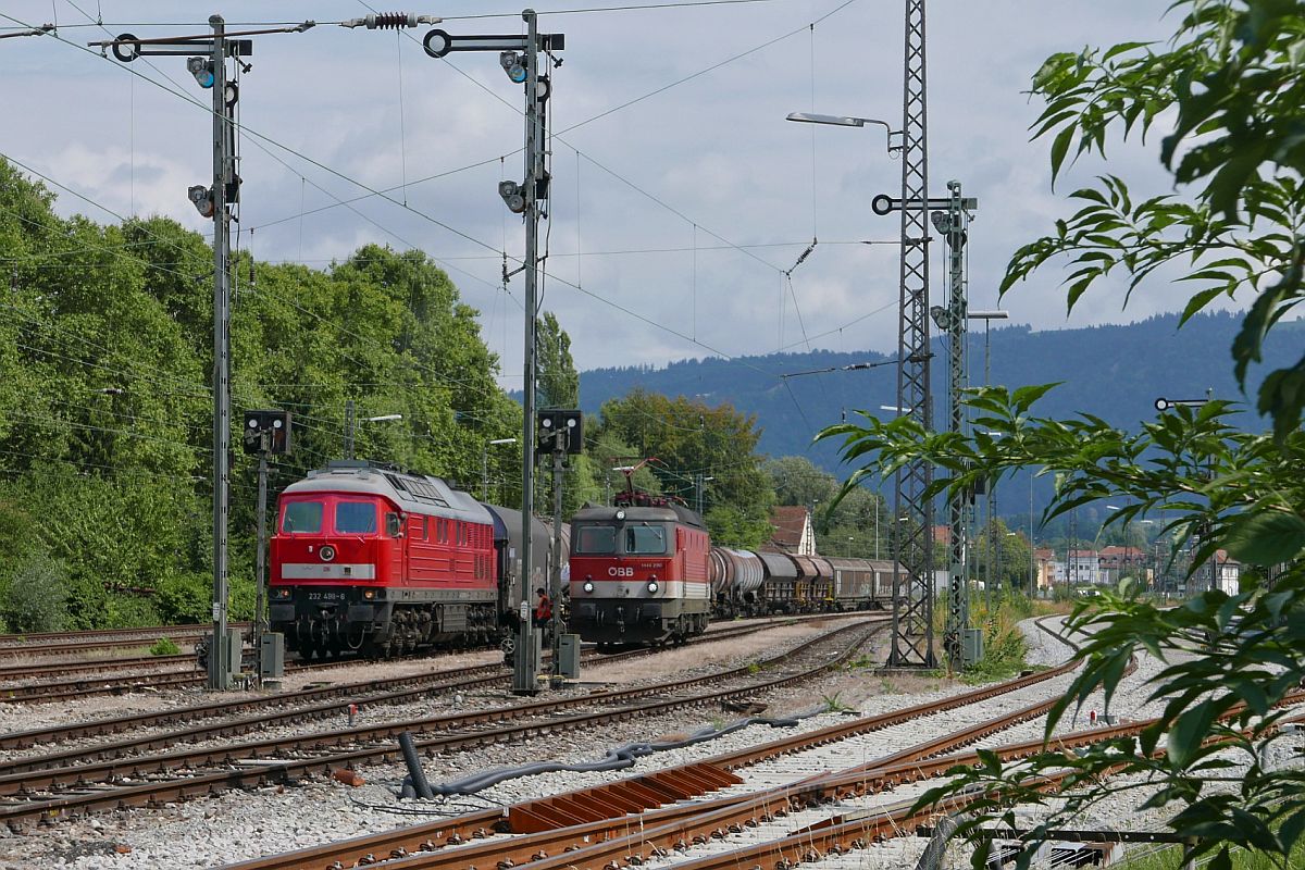 232 498-6 hat am 24.08.2018 in Lindau-Reutin die aus Buchs kommenden Wagen von 1144 290 übernommen, die jetzt nicht mehr vor, sondern neben dem Zug steht.