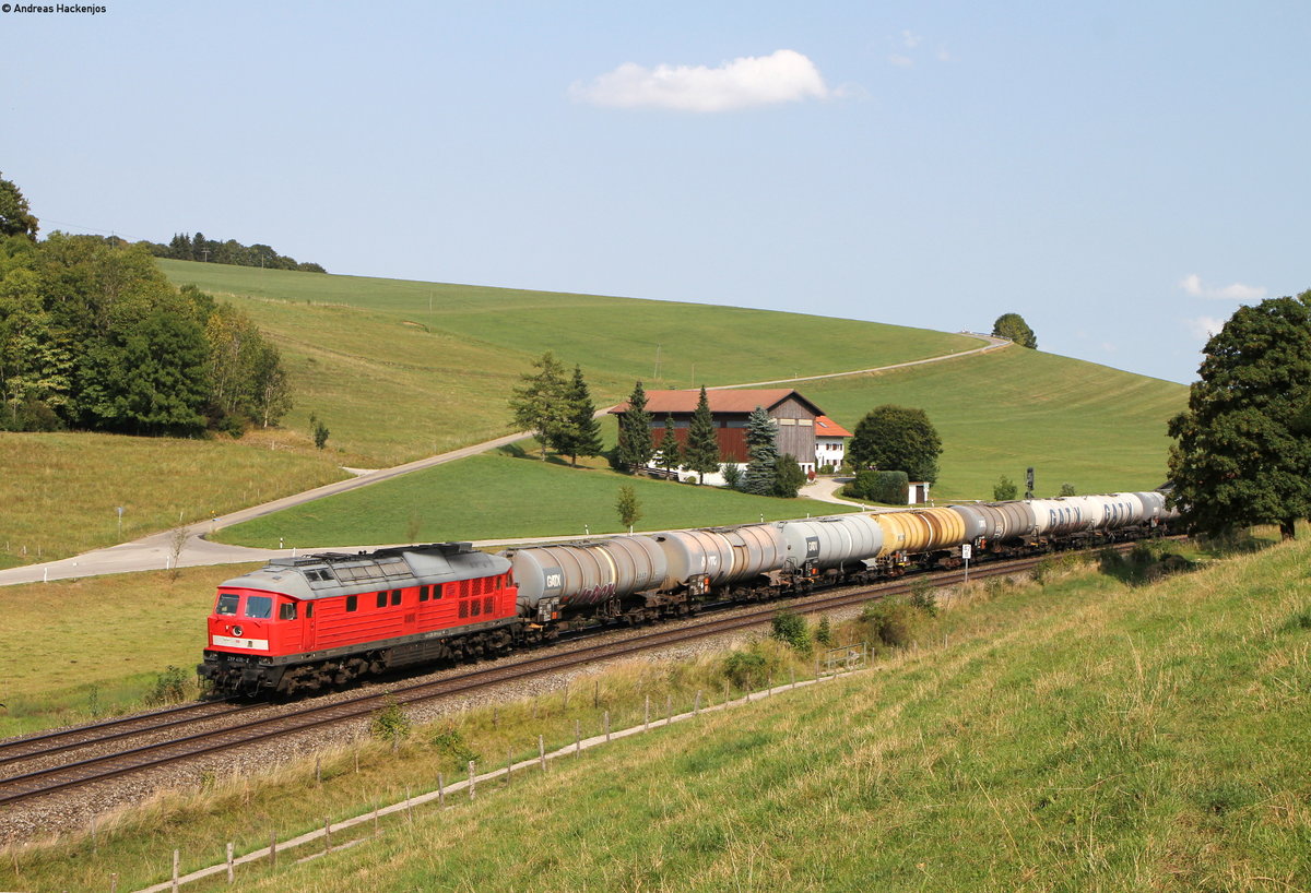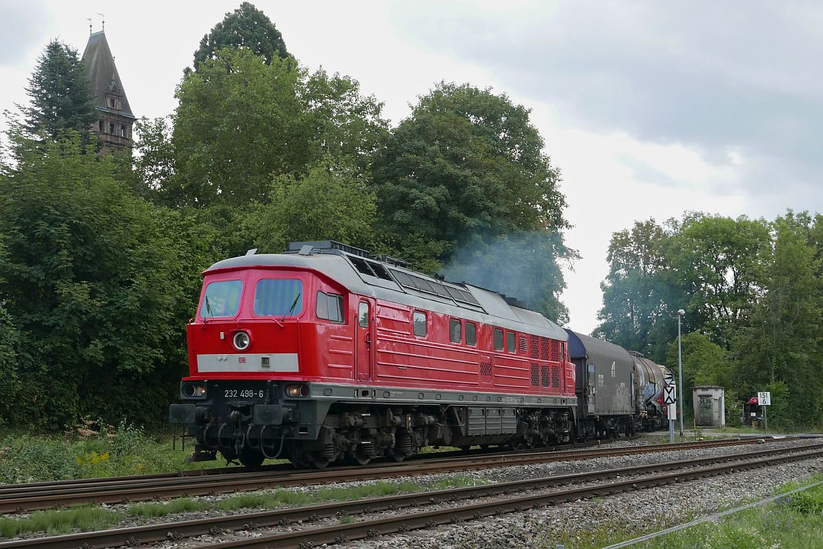 Aus Richtung Ulm kommend durchfährt 232 498-6 den Bahnhof von Biberach (Riß). Im Hintergrund abgestellt ist 363 137-1 der NFG (05.09.2017).