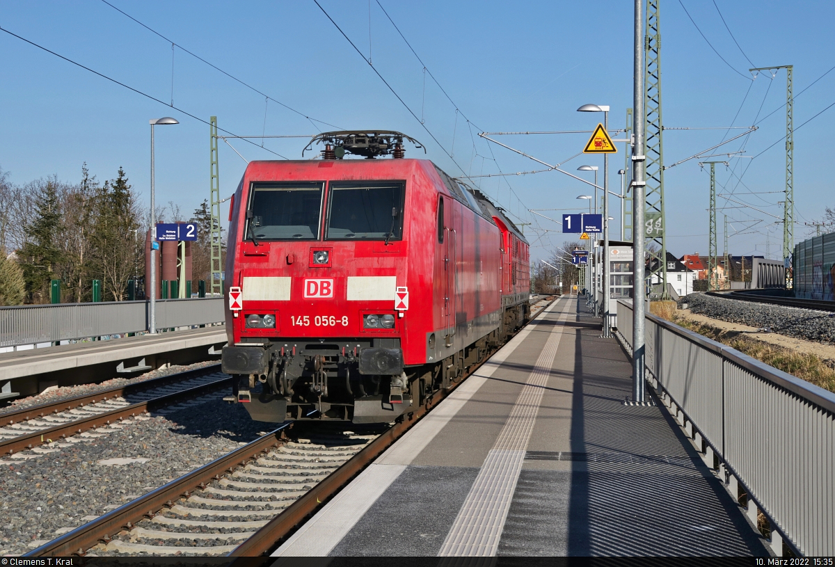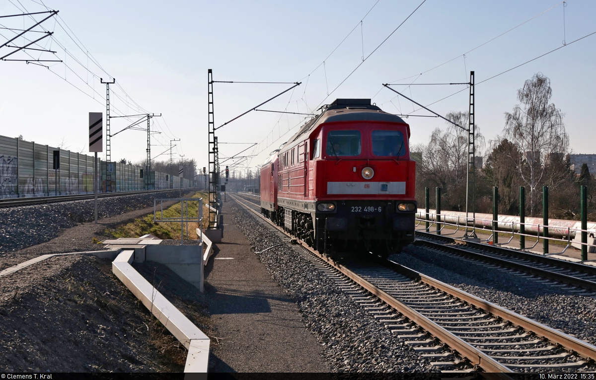 Aus dem strahlenden Licht kommend, schleppt 232 498-6 (132 498-7) die 145 056-8 durch den Hp Halle Rosengarten Richtung ZBA Halle (Saale). Aufgenommen am Ende des Bahnsteigs 1. 🧰 DB Cargo 🕓 10.3.2022 | 15:35 Uhr