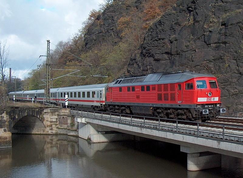 232 543-9 durchfährt am 13.11.04 mit IC 1566 den Plauenschen Grund nahe Dresden.
