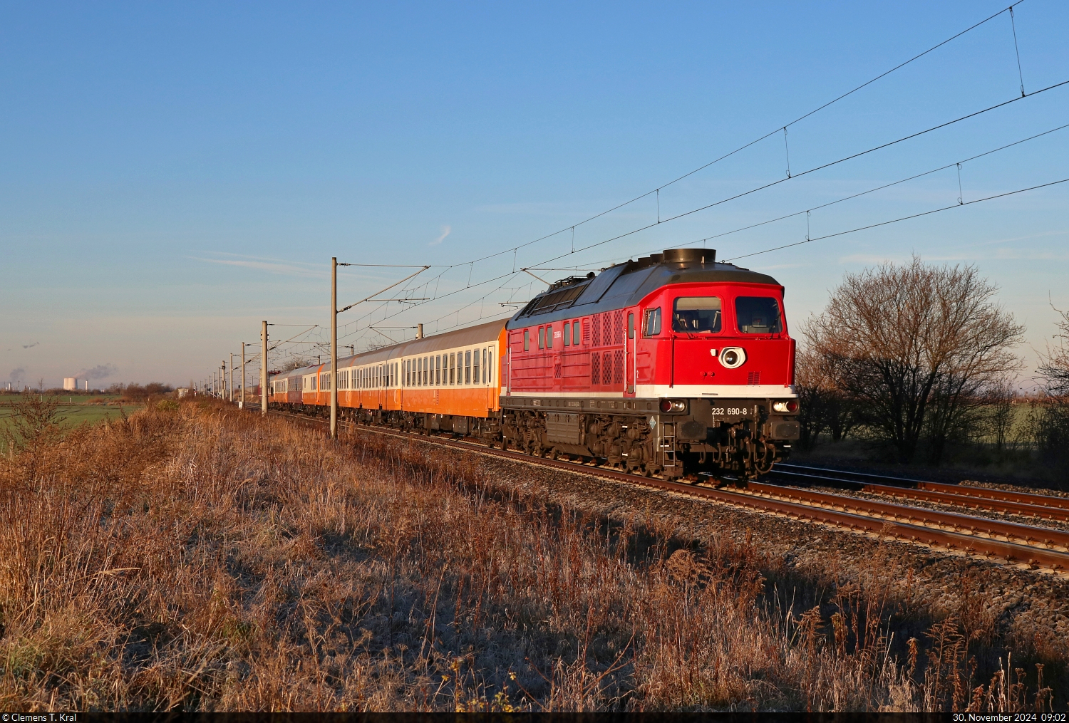 232 690-8 (132 690-9) unterwegs auf Sonderfahrt zwischen Bad Dürrenberg und Kötzschau Richtung Leipzig-Leutzsch. Am Schluss hängt noch 155 195-1 (250 195-5). 🧰 Erfurter Bahnservice GmbH (EBS) 🕓 30.11.2024 | 9:02 Uhr