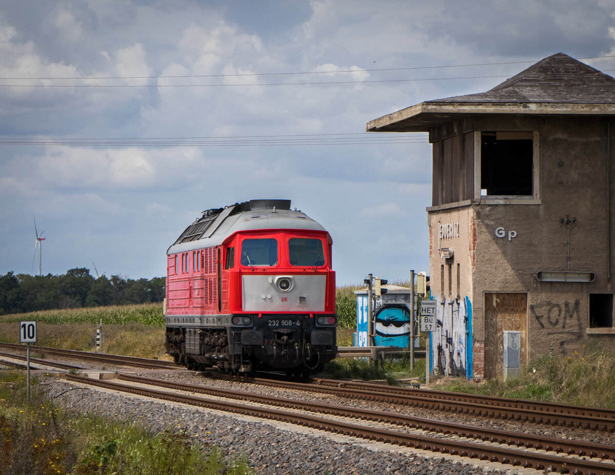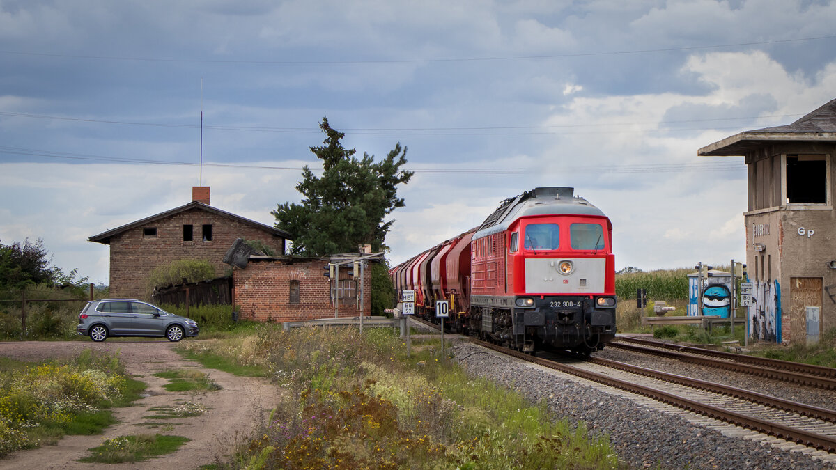 232 908-4 (232 699-9 | 132 699-0) verlässt den Bahnhof Teutschenthal auf dem Rückweg nach Erfurt. Am Haken hat sie zwei Schüttgutwagen der Gattung  Fcs-x <sup>092</sup>  und  Tads-z <sup>958.2</sup>  sowie vier Flachwagen der Gattung  Rs , die sie im hiesigen Schotterwerk abholte.