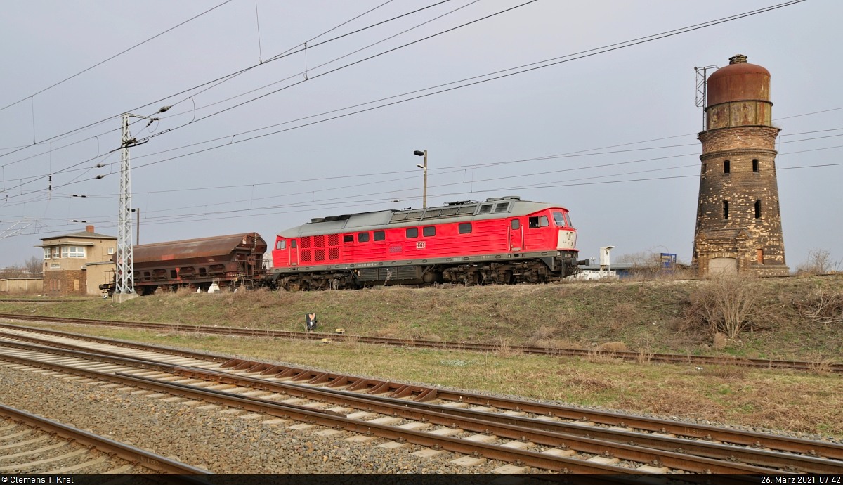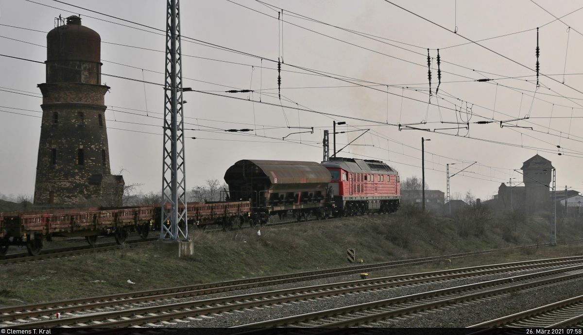 Rangieren mit der 232 908-4 in Teutschenthal Auch während der ganzjährigen Vollsperrung zwischen Halle Rosengarten und Angersdorf bleibt die Anbindung des Schotterwerks im Bahnhof Teutschenthal von Bedeutung. Dreimal in der Woche wird dessen Anschluss mit einem Zug von Erfurt bedient. An einem Freitagmorgen wartet die bereits vor Plan eingetroffene 232 908-4 mit einem Schüttgutwagen der Gattung "Tads-z 958.2" auf dem Ablaufberg am alten Wasserturm. Aufgenommen von der Reichsbahnstraße. 🧰 DB Cargo 🚩 Bahnstrecke Halle–Hann. Münden (KBS 590) 🕓 26.3.2021 | 7:42 Uhr