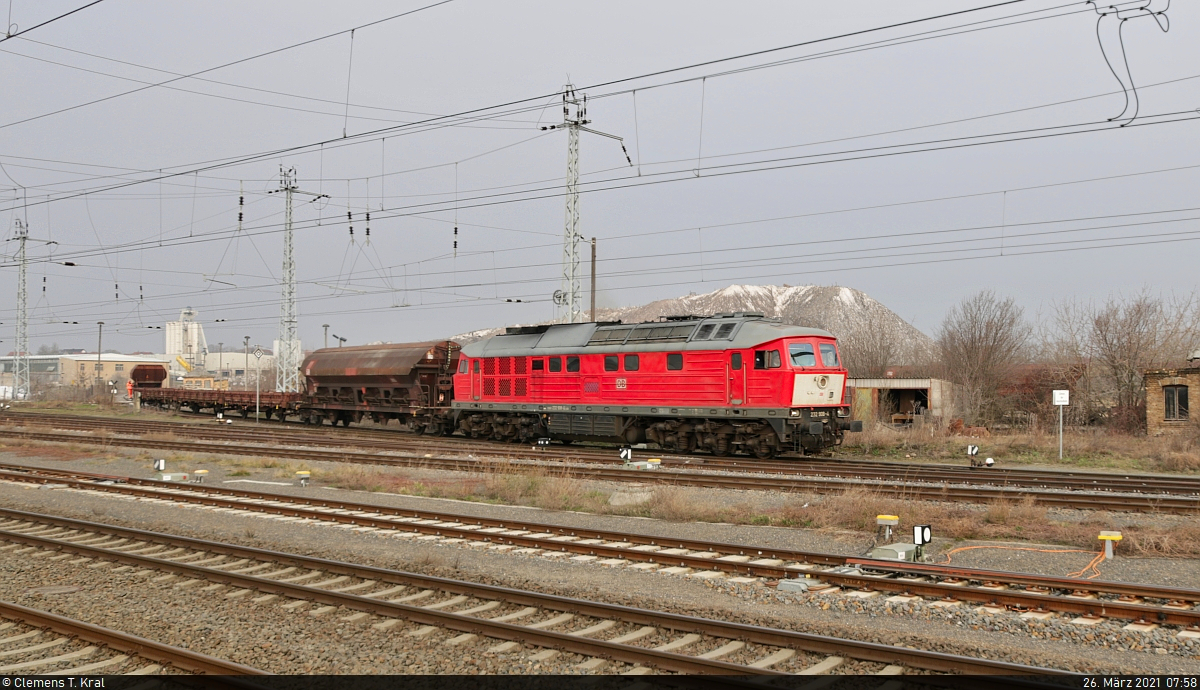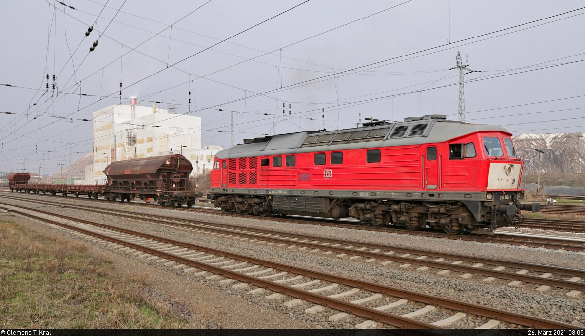 Rangieren mit der 232 908-4 in Teutschenthal Nur wenige Minuten später geht es für die Ludmilla mit einem Schüttgutwagen der Gattung "Tads-z 958.2" rückwärts in den Gleisanschluss des Teutschenthaler Schotterwerks. Durch ihren langjährigen Einsatz im Ruhrgebiet und wohl auch in den Niederlanden trägt sie auf der Front den weißen "Hollandlatz". Nachschuss von der Reichsbahnstraße. 🧰 DB Cargo 🚩 Bahnstrecke Halle–Hann. Münden (KBS 590) 🕓 26.3.2021 | 7:45 Uhr