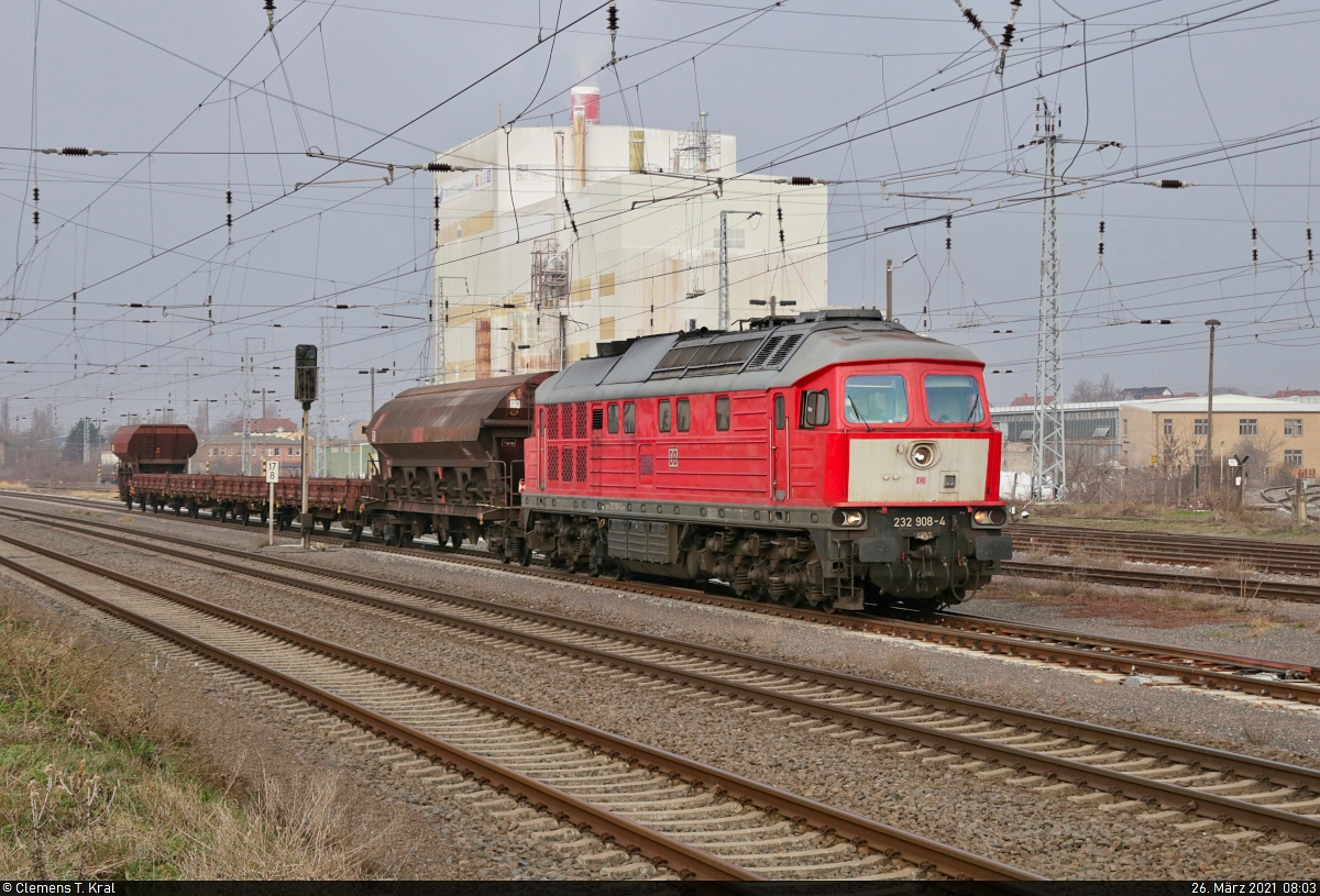 Rangieren mit der 232 908-4 in Teutschenthal Zurück aus dem Anschlussgleis des Schotterwerks kommt die Lok nun zusätzlich mit vier zweiachsigen Flachwagen der Gattung "Rs" und einem Schüttgutwagen der Gattung "Fcs-x 092" (21 80 6453 085-8 D-DB) gefahren. Aufgenommen von der Reichsbahnstraße. 🧰 DB Cargo 🚩 Bahnstrecke Halle–Hann. Münden (KBS 590) 🕓 26.3.2021 | 7:58 Uhr