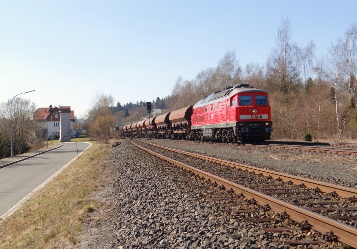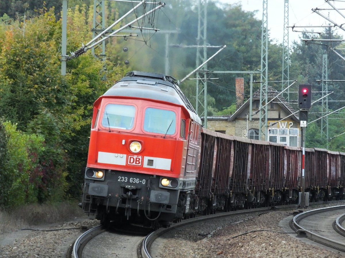 Nachschuss auf 233 636-0 DB als Tfzf, die in Halle-Kanena/Bruckdorf auf der Bahnstrecke Magdeburg–Leipzig (KBS 340) Richtung Halle (Saale) fährt.