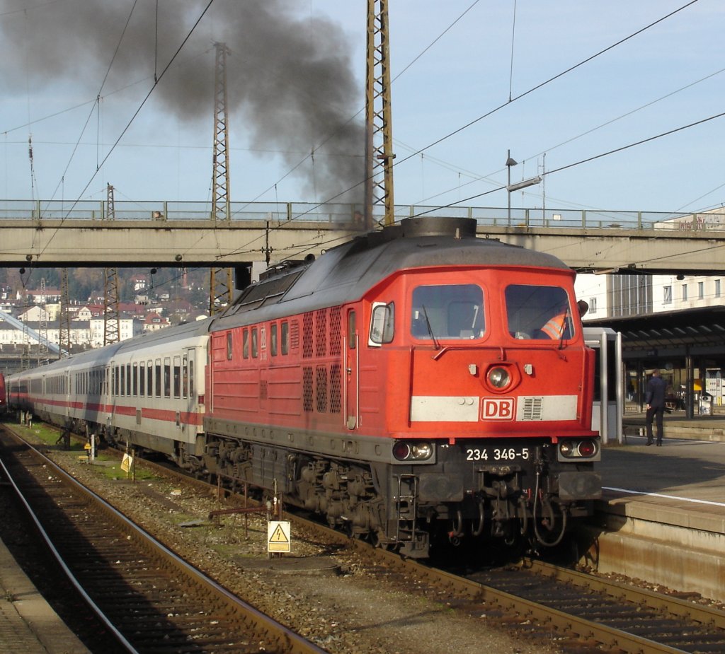 234 346-5 fuhr am 21.08.07 solo aus Gleis 3 des Ulmer HBFs, als sie gerade erst mit dem IC 118 aus Innsbruck angekommen war. Da ab Ulm die Strecke nach Stuttgart elektrifiziert ist, kam in diesem Fall die 101 040-4 an den Zug. P.F.