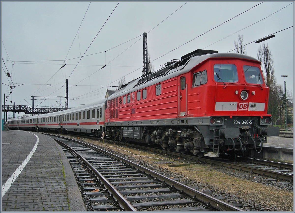 Doch auch im südlichen Abschnitt erfreute der IC mich mit einer Besonderheit: Der Zug wurde von Lindau nach Ulm von einer DB 234 befördert, das Bild zeigt die DB 234 346-5 bei der Übername des Zuges in Lindau.