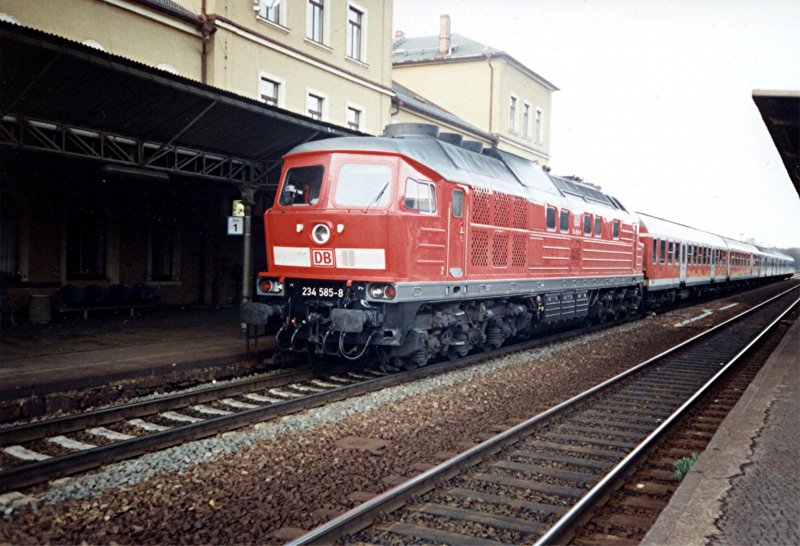 Kurz vor ihrer Ausmusterung bekamen einige 234 sogar noch einen Neuanstrich und Wendezugsteuerung! Eine der wenigen war 234 585-8, die hier im Herbst 1999 den RE Görlitz-Dresden am Haken hat.