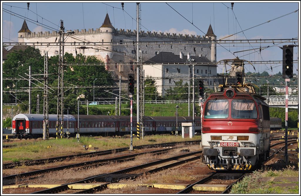 240 005-9 posiert vor dem mächtigen Schlosss in Zvolen. (07.04.2014)