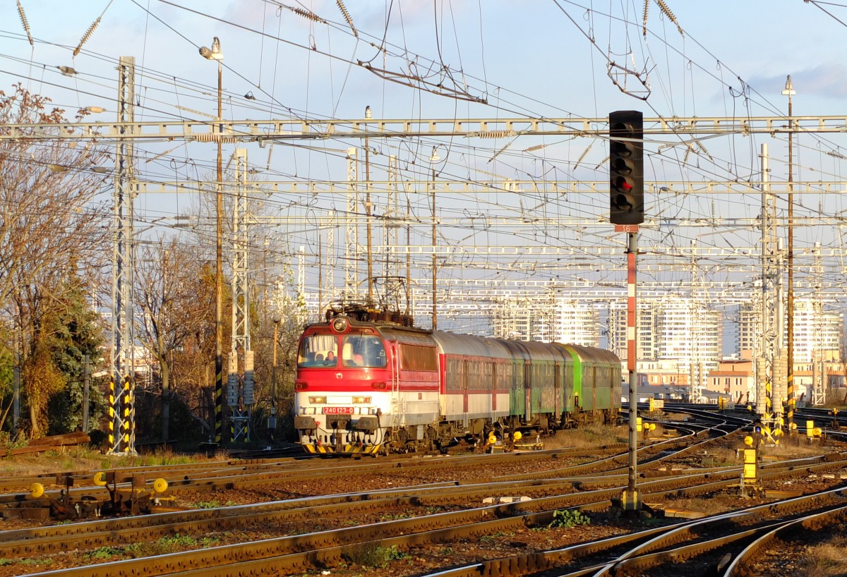 240 123-0 fährt mit Regionalzuggarnitur von Abstellgleise nach Hauptbahnhof von Bratislava/Preßburg; Zug wird fährt als Os 3051 Bratislava hl. st. (16:01) – Trnava/Tyrnau (16:48) (werktags in der gleichen Zeit Os 2057 Malacky – Bratislava hl. st. – Trnava – Leopoldov/Leopoldstadt); 30.11.2013 Tomas Kowalski