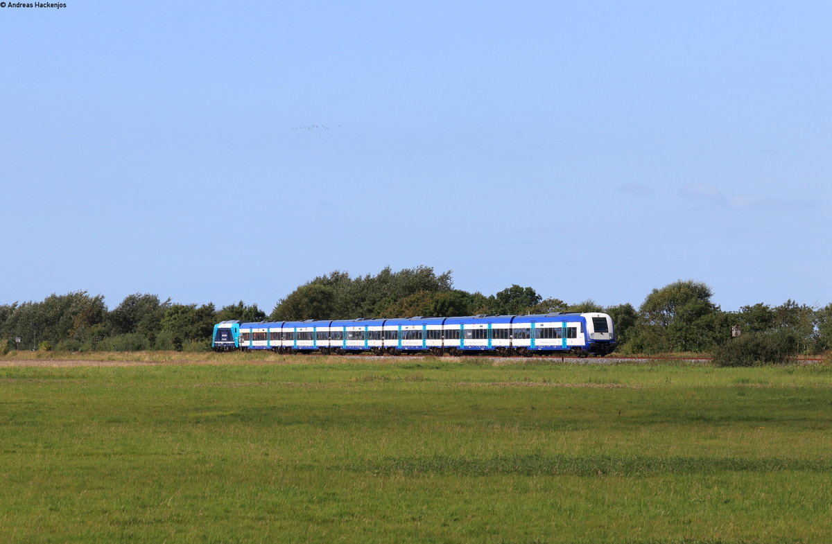 Die Diesellokomotive 245 205-0 zieht als RE6 eine Married-Pair-Garnitur nach Sylt, so gesehen im Juni 2024 bei Friedrich-Wilhelm-Lübke-Koog. Christian Bremer