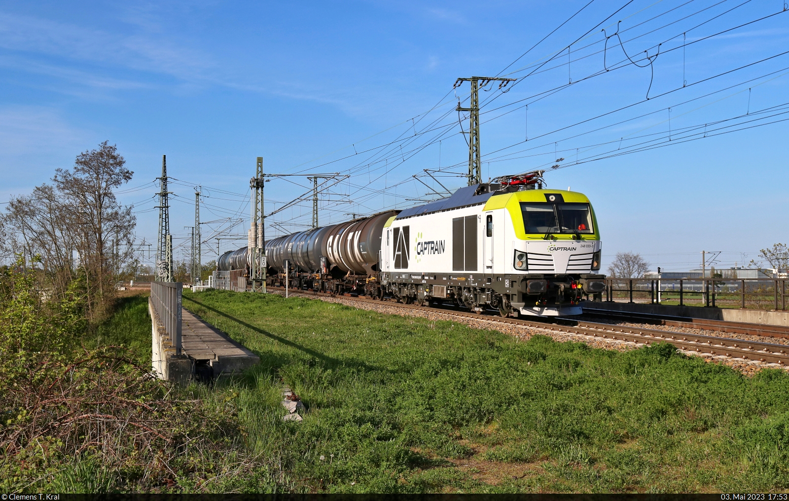 Am Morgen des 05.04.2023 war Captrain 248 033-3 mit einem Zug aus Silo- und Kesselwagen auf dem Weg in Richtung Halle. Fotografiert in Schönebeck-Felgeleben. Christian Geschonneck