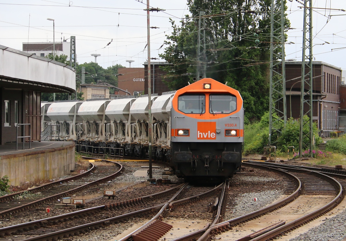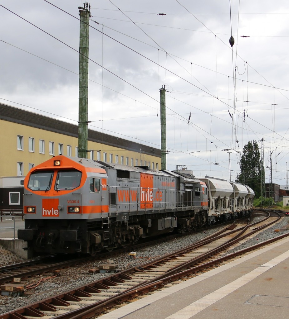 Nochmal in voller Pracht der Tiger der HVLE, 250 004-9 (V330.04), bespannte am 19.06.2014 einen Kieszug und passiert gerade Bremen Hauptbahnhof.
