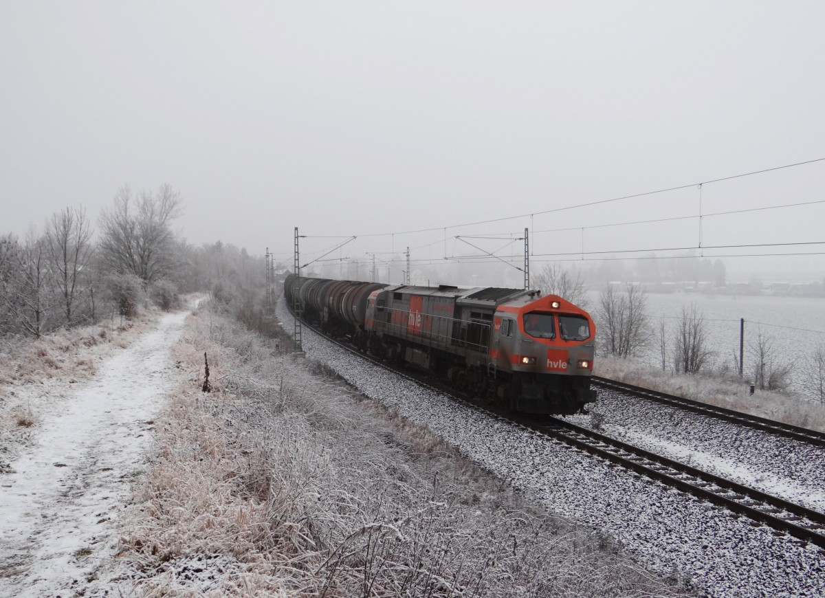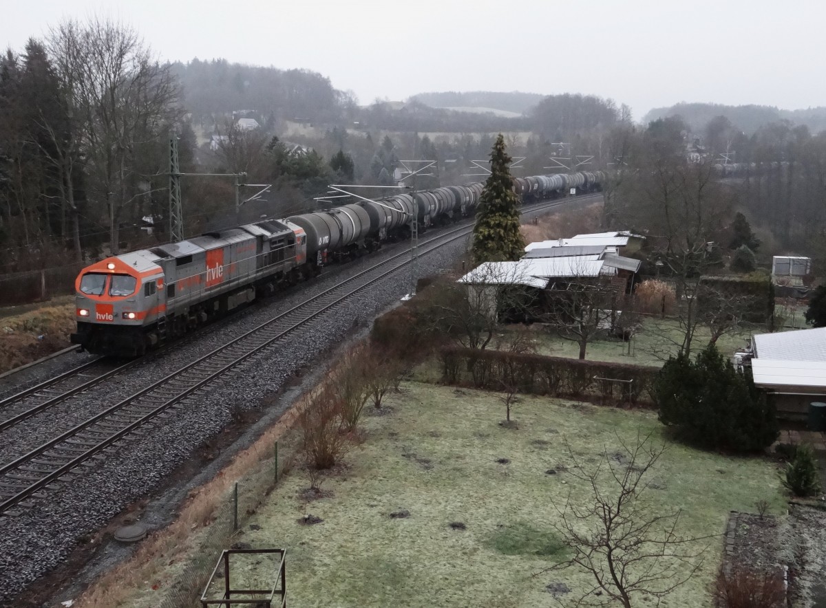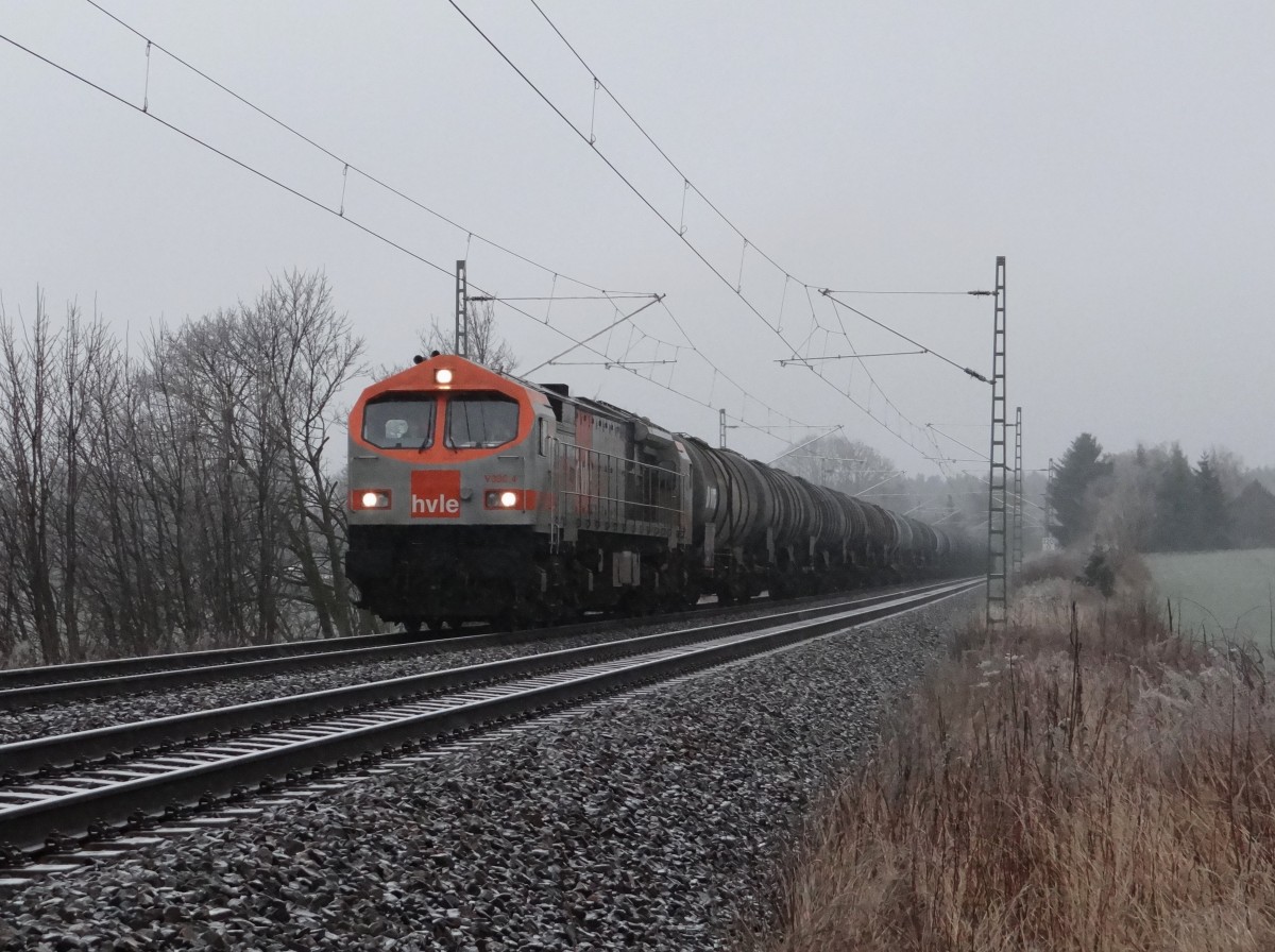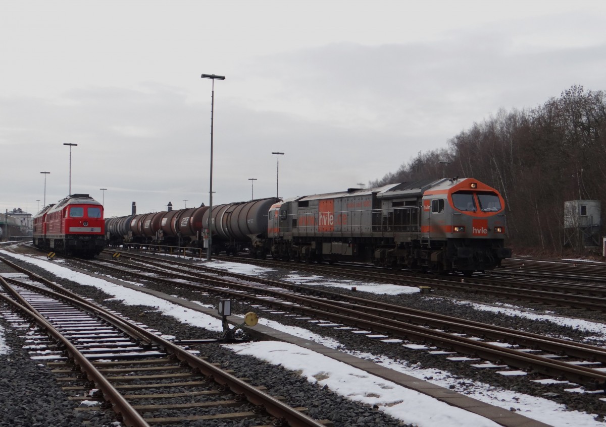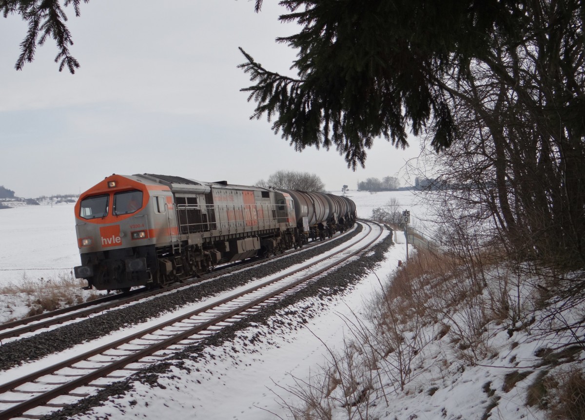 Hvle Tiger V330.4 (250 004-9) ist am 04.02.14 mit einem Kesselzug in Lengenfeld kurz vor Marktredwitz zusehen.