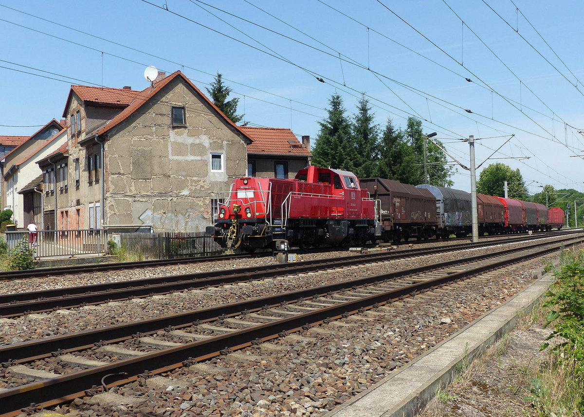 Übergabezug mit 261 044-2 (Voith Gravita) DB durchfährt im Abendlicht den Bahnhof Teutschenthal auf der Bahnstrecke Halle–Hann. Münden (KBS 590) Richtung Halle (Saale).